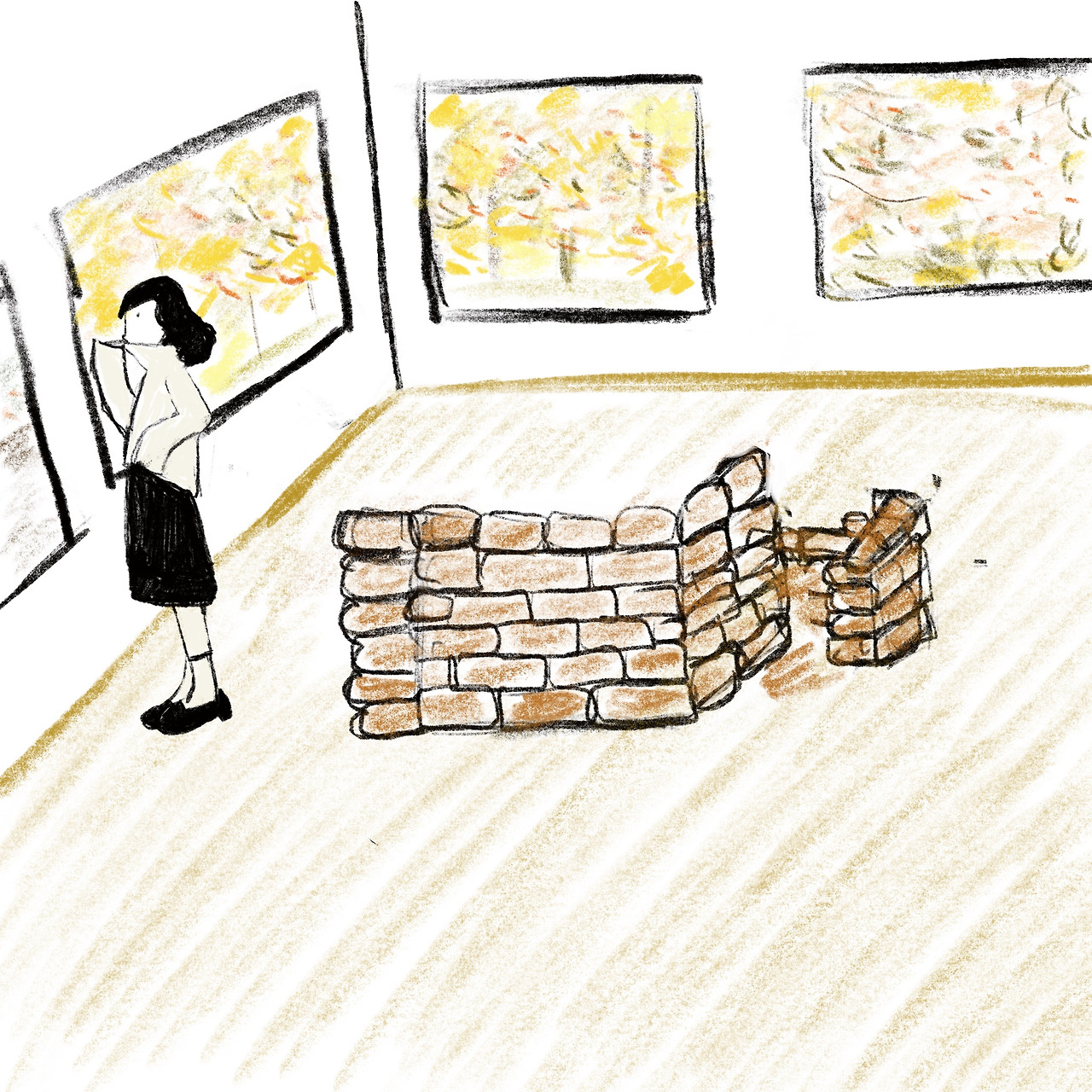 나선형 계단을 따라 2층으로 올라가면 더 풍요롭고 화려한 금빛 가을이 채워져 있었다. 한 가운데 벽돌로 낮은 벽이 세워진 설치 작품이 있었는데, 전쟁으로 인한 폐허의 현장이자 달리 보면 재건이기도 한 벽돌이 뿜어내는 예술적인 그 무엇을 솔직히 느끼지는 못했다. 조용히 의아해하면서 주위를 천천히 돌았다. 여전히 잘 이해는 가지 않았다.