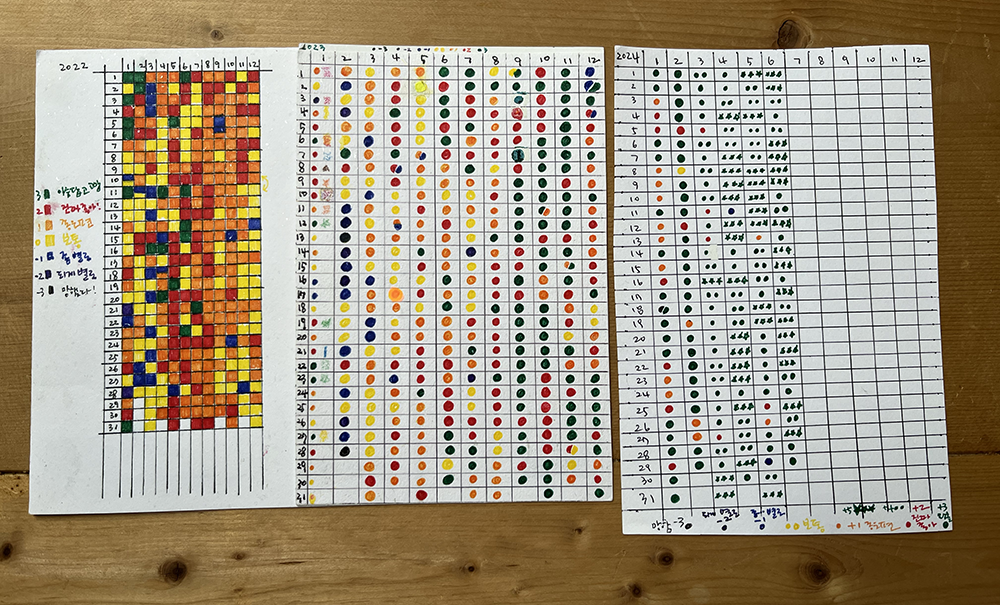 저는 사실 마음날씨표라고 하루의 기분과 기력을 7점 척도로 정리하고 있습니다. 2019년부터요. 그렇게 올해부터는 기초체력이 많이 좋아졌는지 늘 ‘0점 보통, 1점 좋은편, 2점 진짜 좋아, 3점 완전 좋아’만 적더라고요. 그래서 3월부터는 좋은 쪽의 지표를 두개 늘려서 ‘4점 진짜 진짜 좋아, 5점 최고야’를 만들었는데도 3~7점 사이에요. 이제 이 방식으로 마음을 기록하는 건 수명이 다했다는 생각이 점점 들고 있어요. 그래서 정량평가가 아닌 정성평가로, 월말정산을 하면 어떨까 하는 생각이 들었어요.
