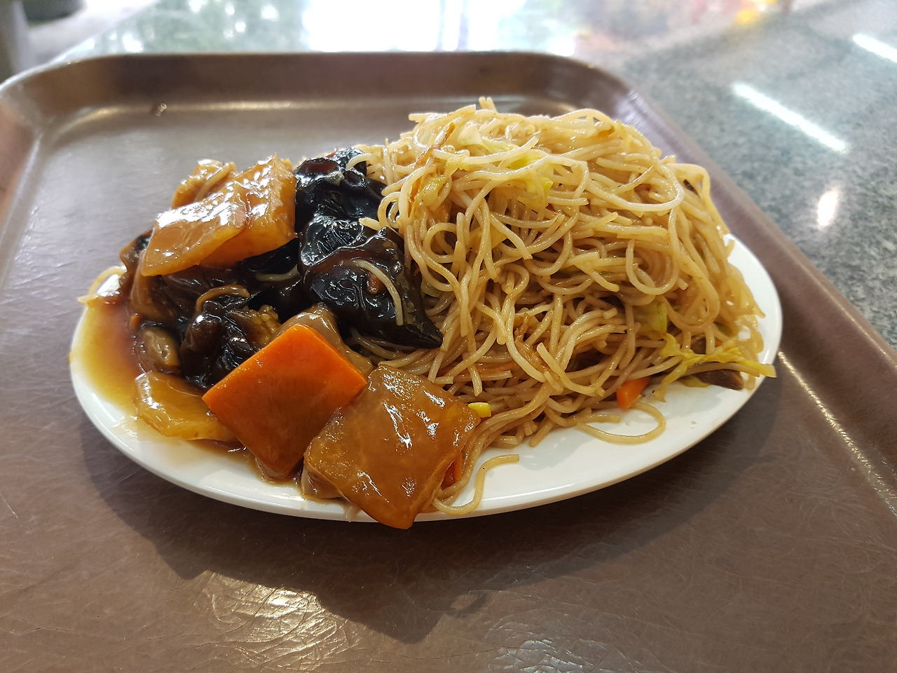 다시 포린 사원으로 돌아와서 사찰 내를 여기저기 기웃거리고는 절 안에 있는 vegetarian restaurant에서 turnip cake(순무 케이크)와 dumpling을 사 먹었는데, 맛이 너무 좋아서 나도 모르게 눈이 휘둥그레지고 말았다. 별것 없어 보이는 소박한 음식이었는데, 절밥이 맛있다는 말을 이럴 때 두고 쓰나 싶었다. 결국 fungus fried noodles도 주문했는데 연신 최고를 외치며 정신없이 흡입하고 말았다. 양도 엄청 푸짐한 데다가, 면을 어떻게 볶았는지 하나도 느끼하지가 않았음. 옆에 같이 나오는 각종 버섯과 야채도 아삭거리는 맛이 신선함이 가득했다.