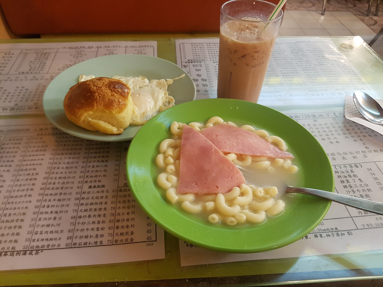 프린스 에드워드(Prince Edward)역에서 조금 떨어진 홍운빙청반점(Hung Wan cafe, 鴻運冰廳餅店)은 주성치 영화 '행운일조룡' 주 배경이 되는 '행운다과점'의 무대가 되었던 장소이다. 영화는 보지 못했지만, 뭔가 현지식으로 식사를 할 수 있을 거라는 기대감으로 오게 된 가게이다. 예상은 정말로 딱 들어맞았으니, 영어 메뉴도 없어서 사전과 구글 번역을 총동원해 시킨 조식 메뉴는 이러했다.