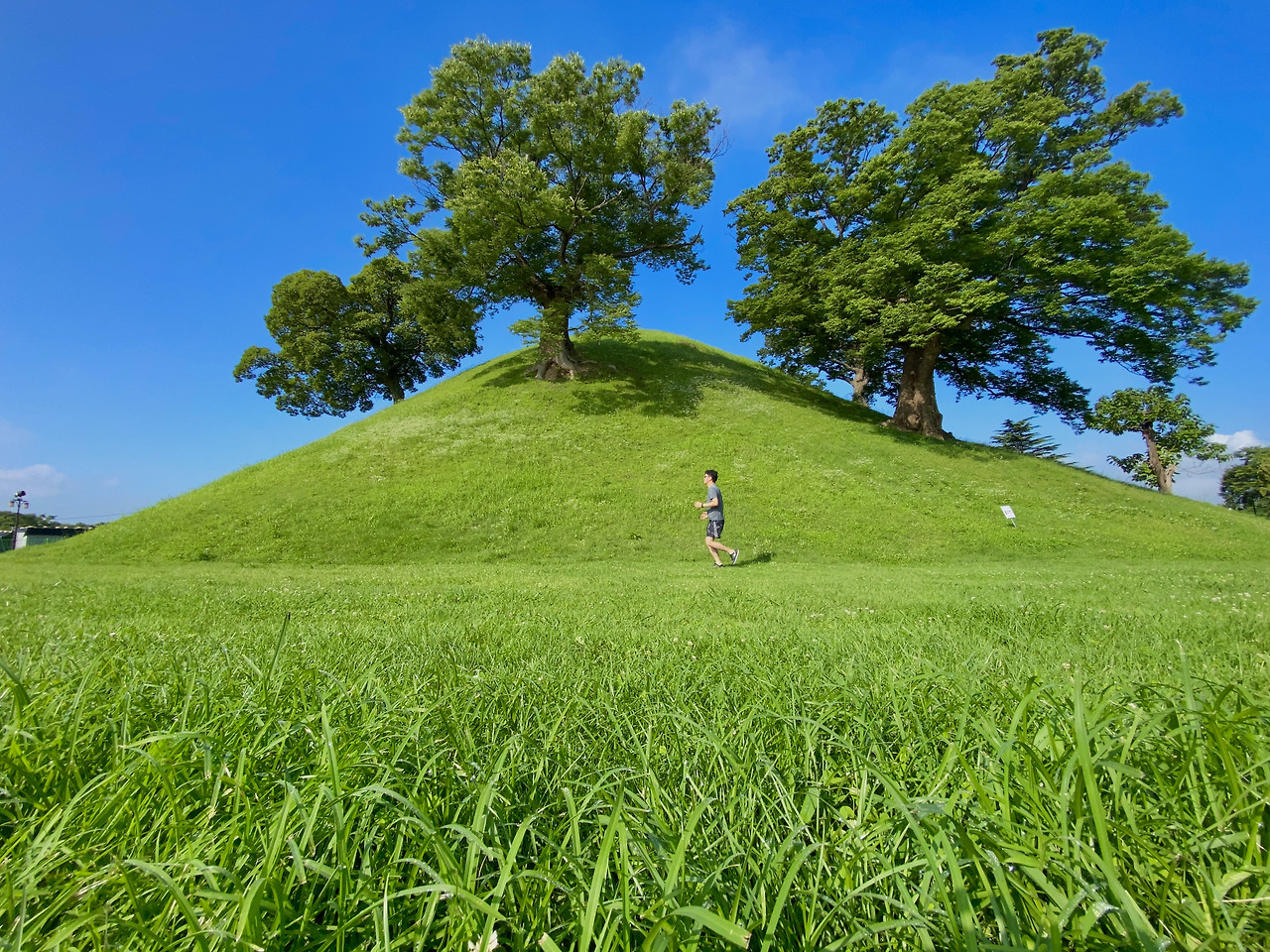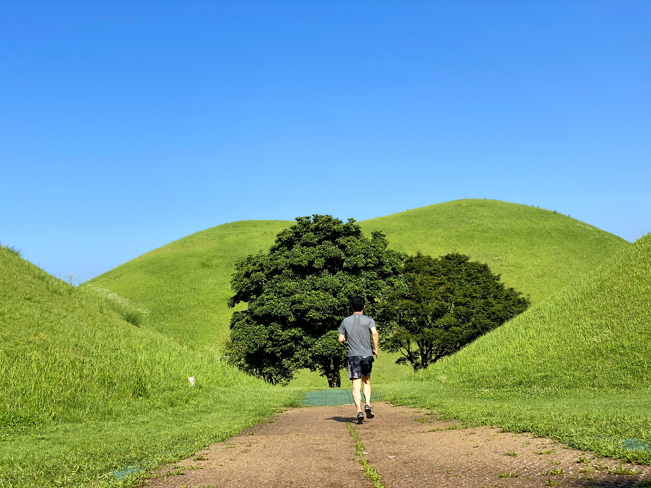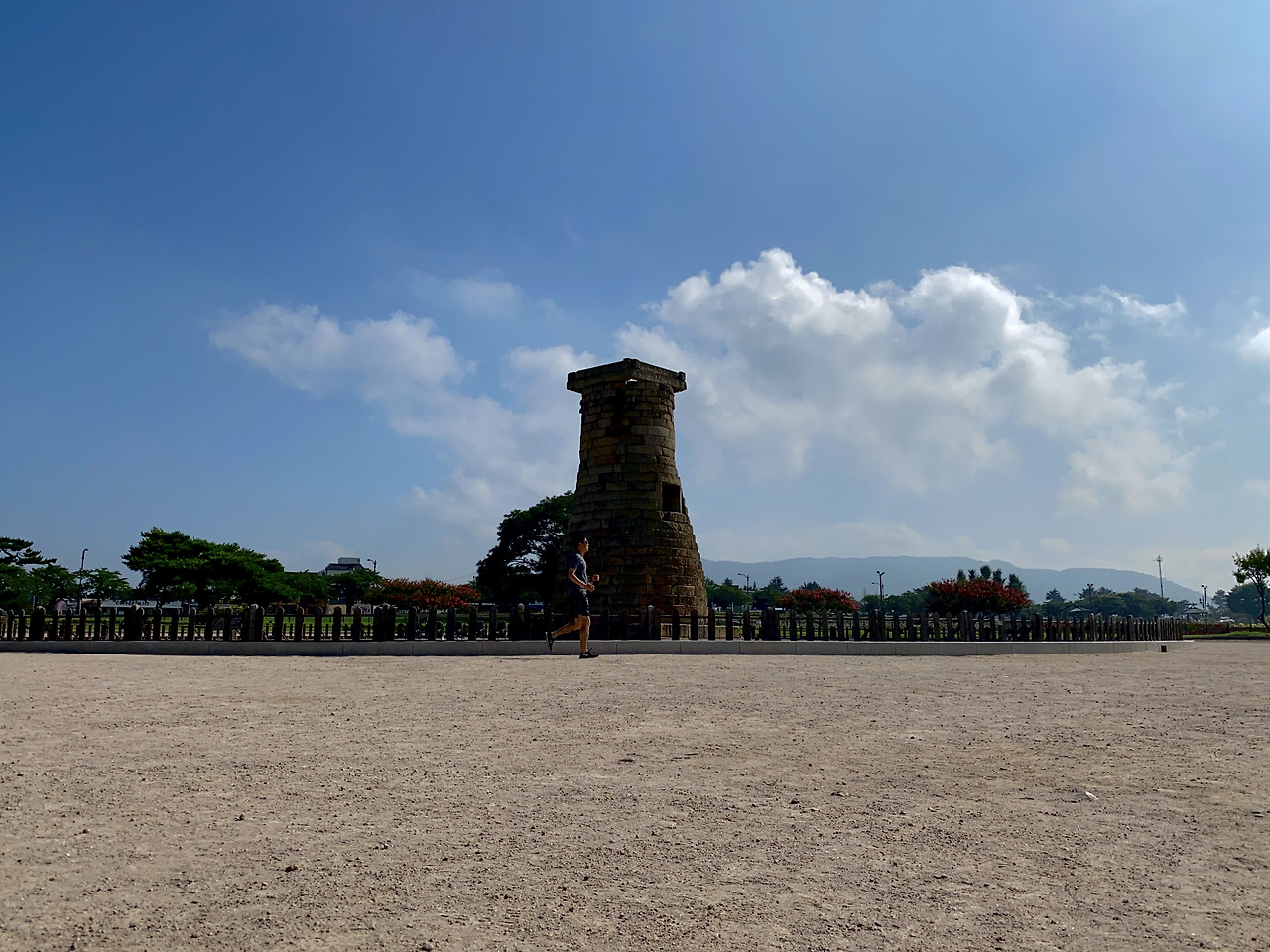 공식적으로 대릉원의 입장은 9시부터지만, 시민들의 운동을 위해 열어 놓은 후문을 통과해서 대릉원의 숲 속을 달린다. 크고 작은 능 사이에 조성된 소나무 숲 속으로 아침 햇살이 스친다. 도심에서 1분이면 천년의 시간을 뛰어넘어 고대의 공간으로 타임워프 한 기분을 낼 수 있다. 대릉원을 달리기로 통과하는 데는 채 5-7분이 걸리지 않는다. 다음은 넓게 펼쳐진 동부사적지구이다. 숲에서 폐가 시원해졌다면, 이곳에선 시야가 시원해진다.