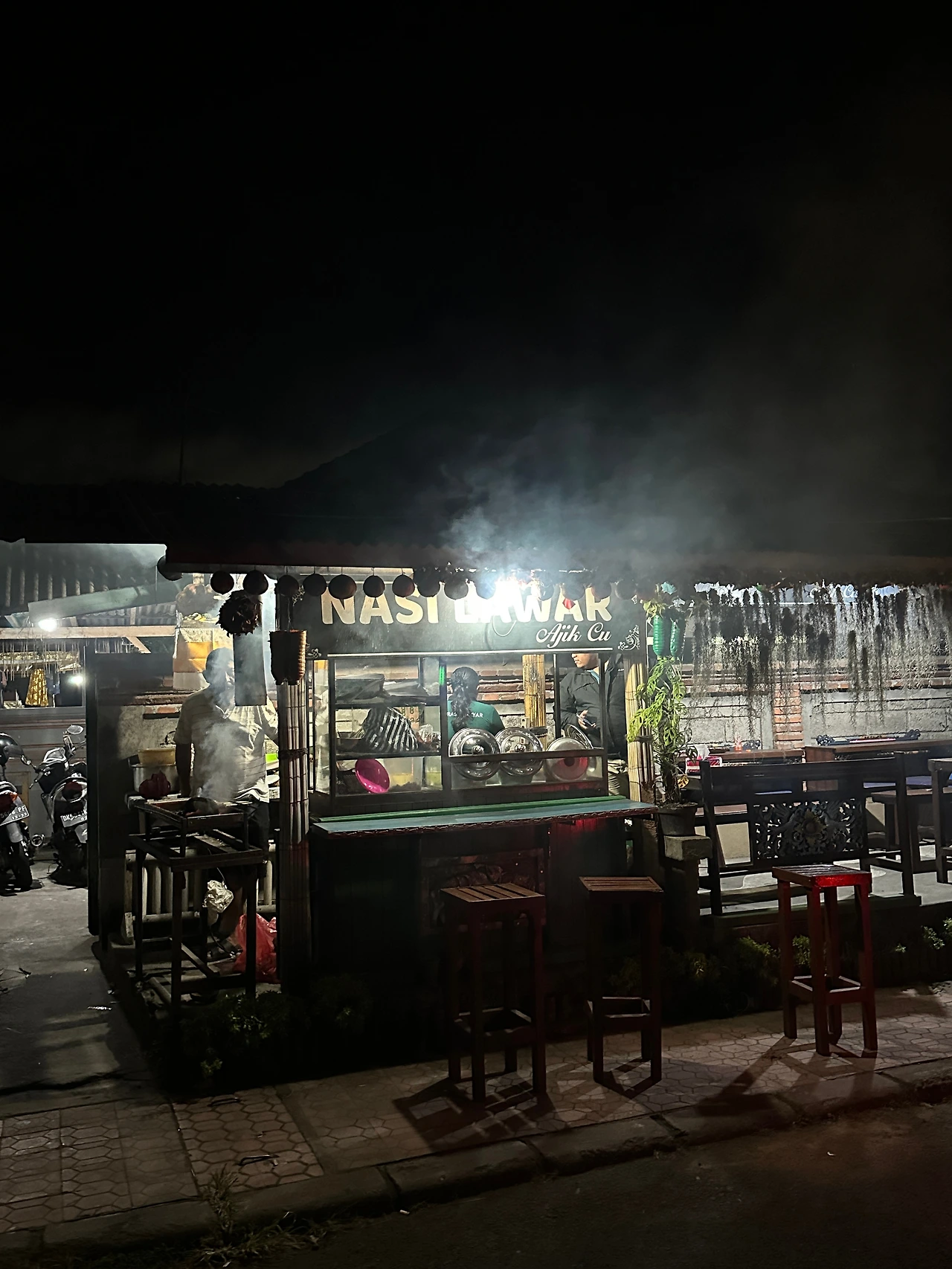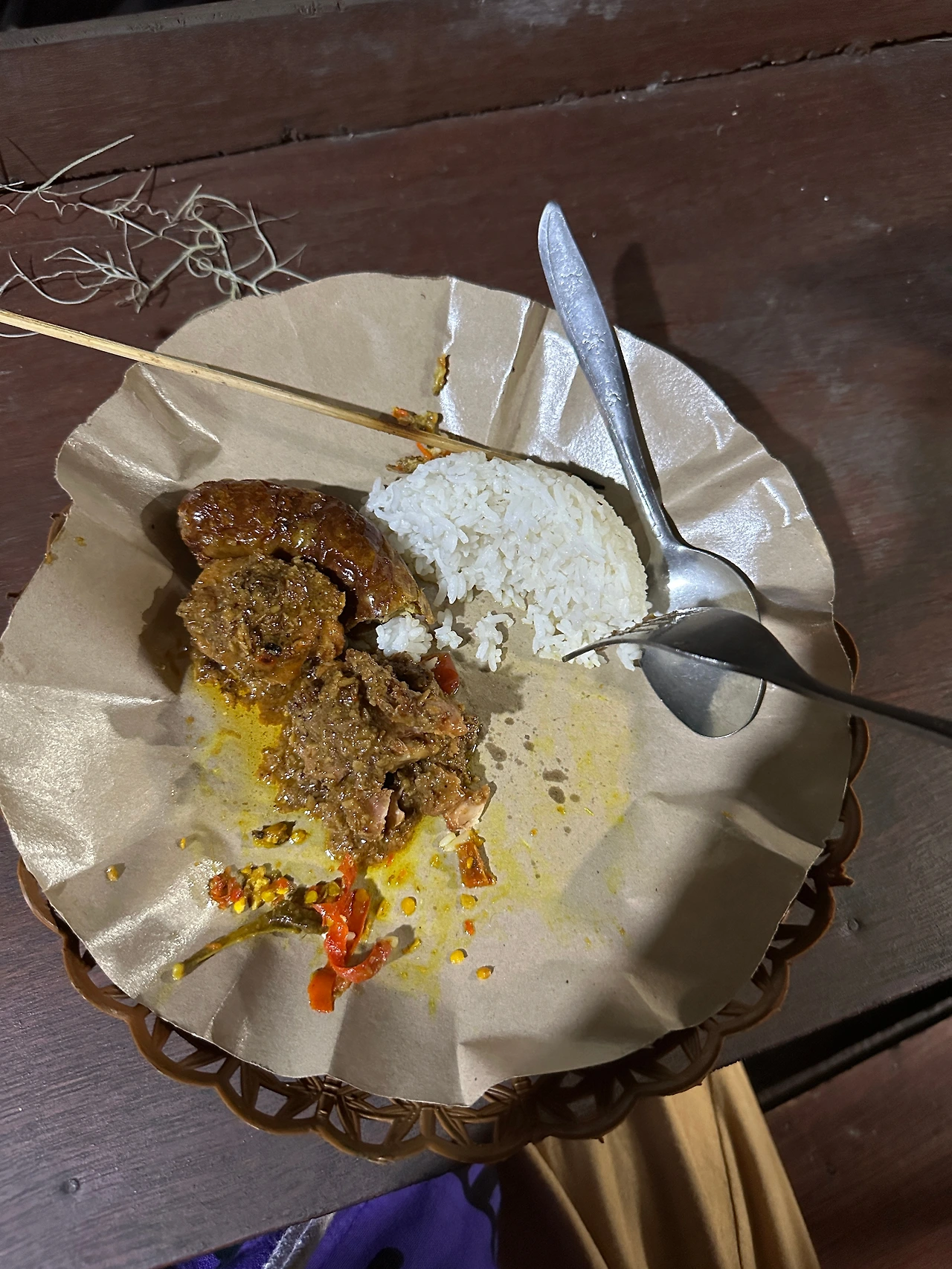 우붓에서의 첫 저녁을 현지식으로 먹은 건 자연스러운 결과였다. 우붓에서 가장 크고 유명한 요가원인 요가반에서 저녁 요가 수업을 듣고 집에 걸어가고 있는데 길 한쪽에 좌판도 아니고 그렇다고 식당도 아닌 곳이 눈에 띄었다. 고급 좌판이라 해야 할까? 현지인들이 몇 명 앉아 저녁을 먹고 있었다. 나도 냅다 들어가 영어가 통하지 않는 주인부부에게 손가락으로 이것저것 가리키며 식사를 주문했다. 소심하게 고기 두 점과 밥을 시키고 먹어보니 의외로 맛있는 거였다. 다 먹고서 다른 고기도 추가로 주문하고도 내가 낸 값은 총 '2000원'이었다. 싸도 너무나 싼 가격에 놀라면서도 한편으로는 내가 2000원에 한 끼를 해결했다니, 믿기지 않고 재미있었다.
