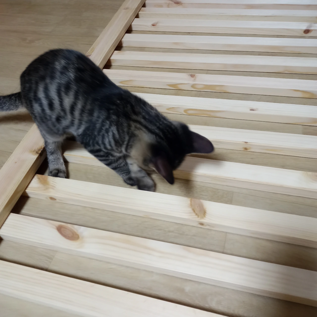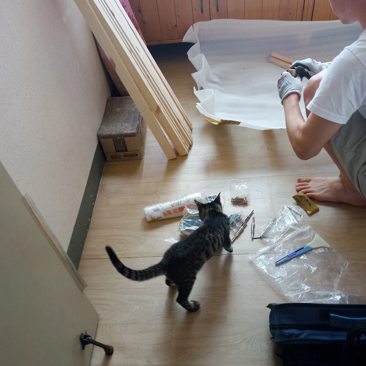 만드는 과정은 생략할게요. 그냥 딱 보면 아시겠죠? 나무들 줄 세워서 놓고 나사만 박으면 되지요. 저는 이렇게 쉽게 말합니다만 만드는 사람 입장에선 간격 맞추기가 좀 까다로울 듯도 합니다. 송이도 뭔가 참견하는 듯하네요.