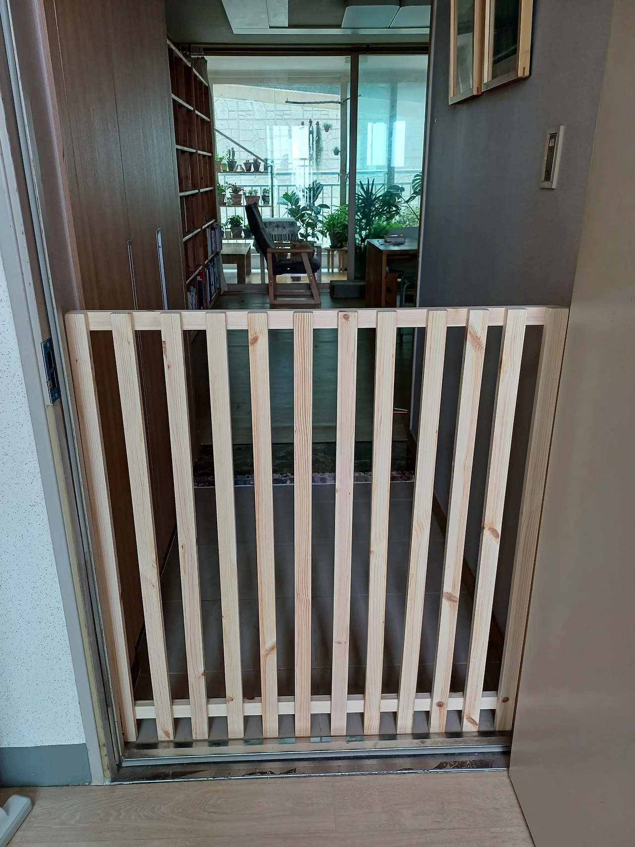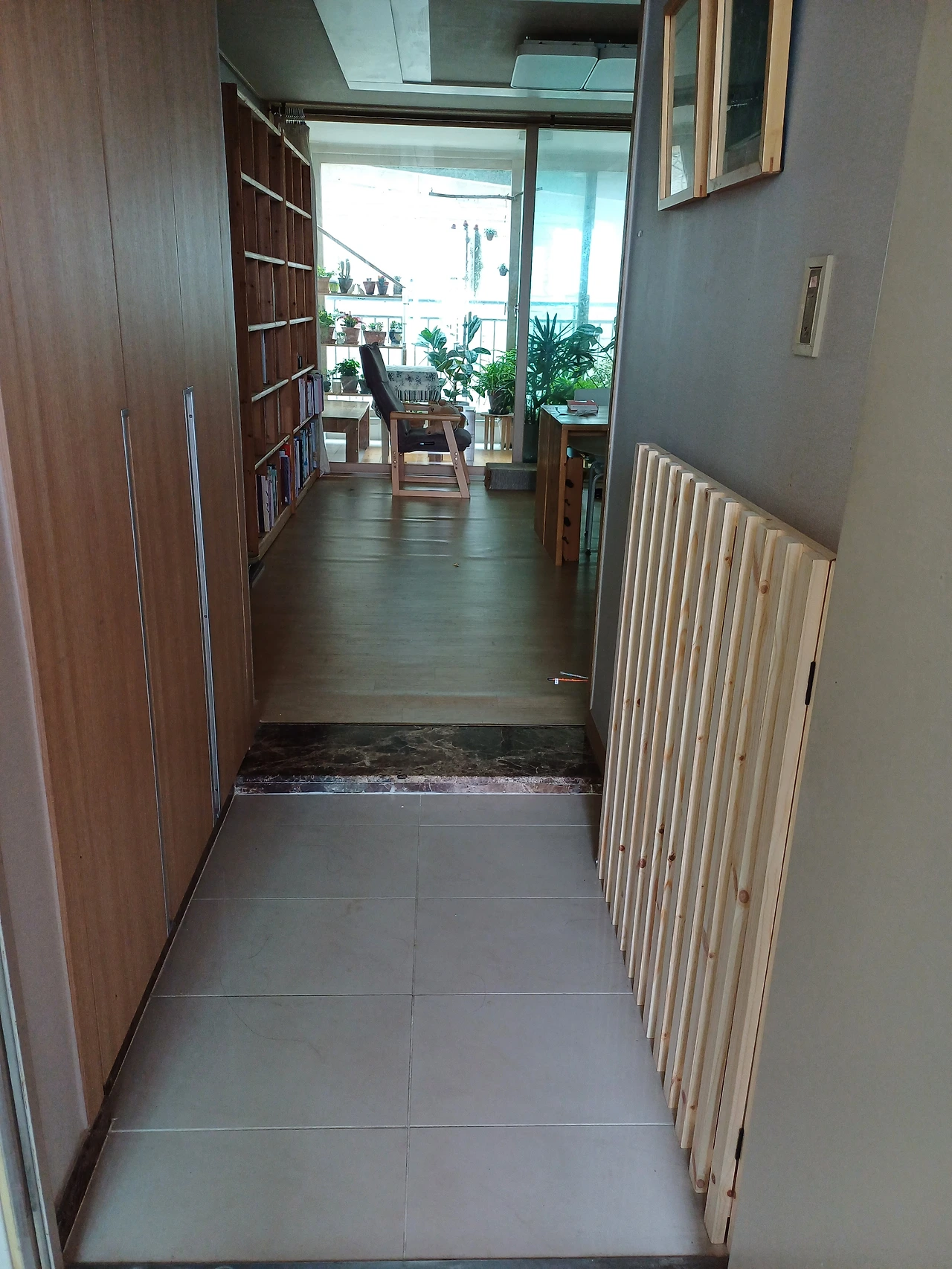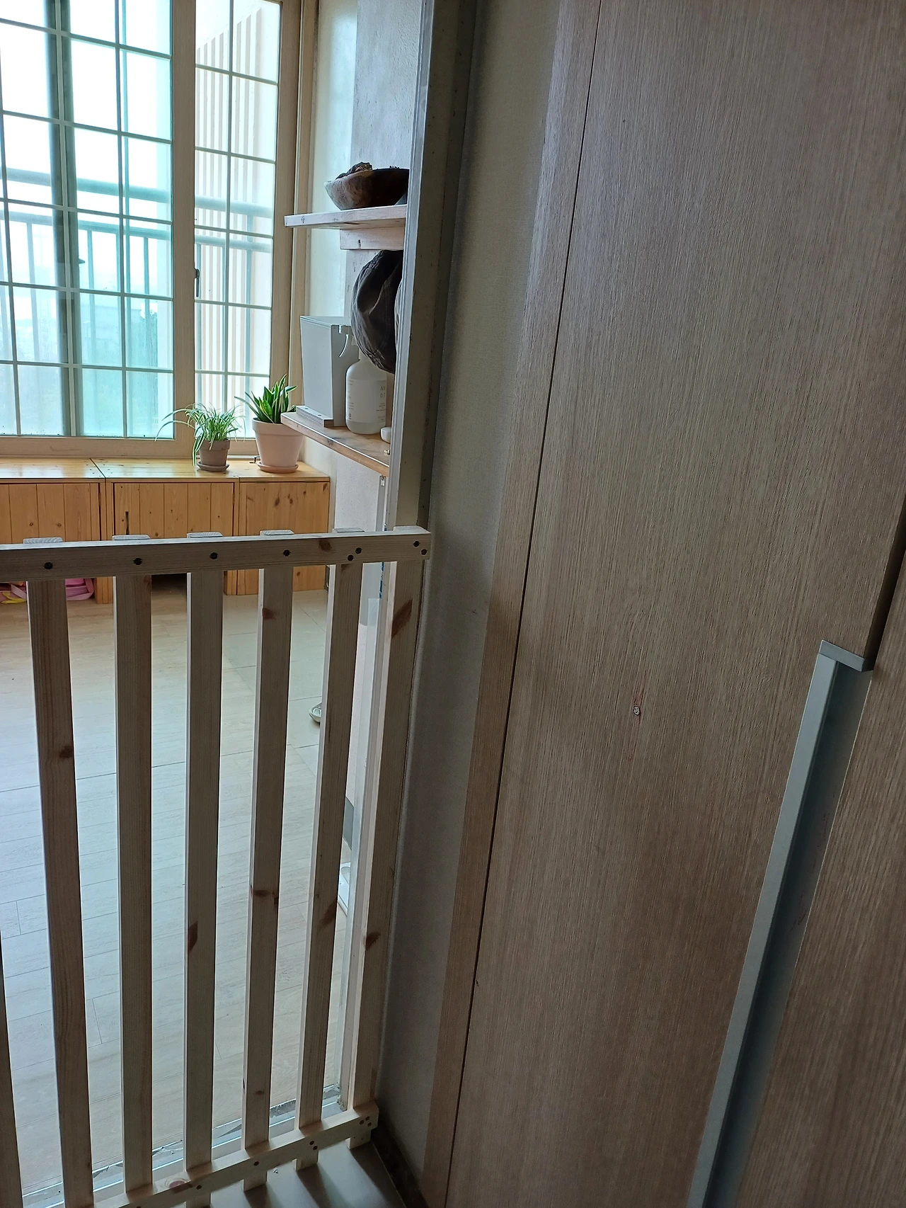 방묘문을 만들어 놓고 보니 '송이 가출 방지' 외에도 유용한 면이 참 많아요. 요즘 같은 장마철엔 젖은 우산이며 신발이며 현관이 질척한데 문을 닫아놓으니 송이가 근처에 갈 일이 없어서 좋고요. 무엇보다도 울타리가 주는 효과 같은 게 있더라고요. 든든하니 마음의 안정이 되네요. 그리고 살짝 인테리어 효과도 있지 않나요? 집 분위기와도 어울리는 듯 제 눈엔 꽤 괜찮아 보여요.