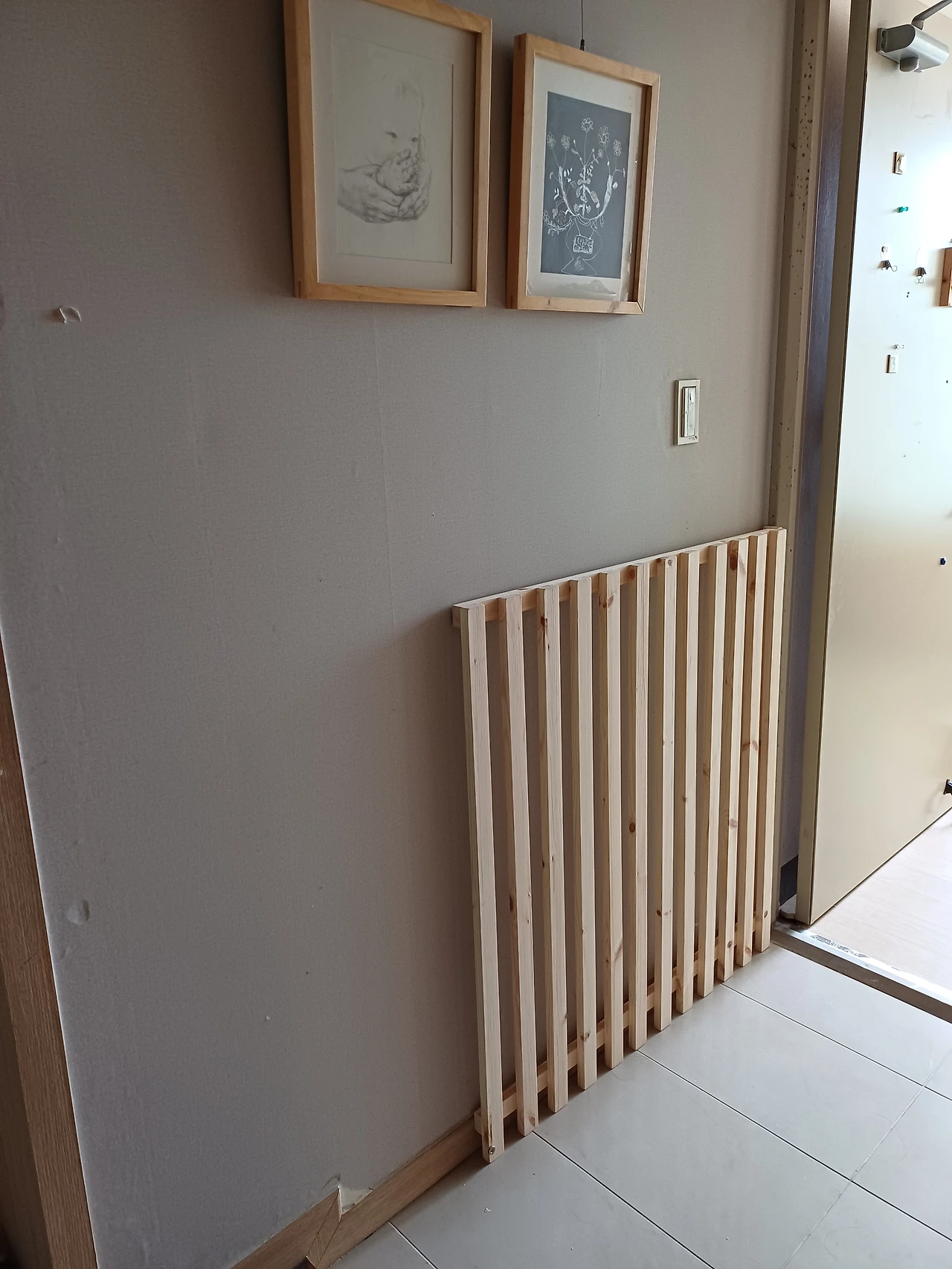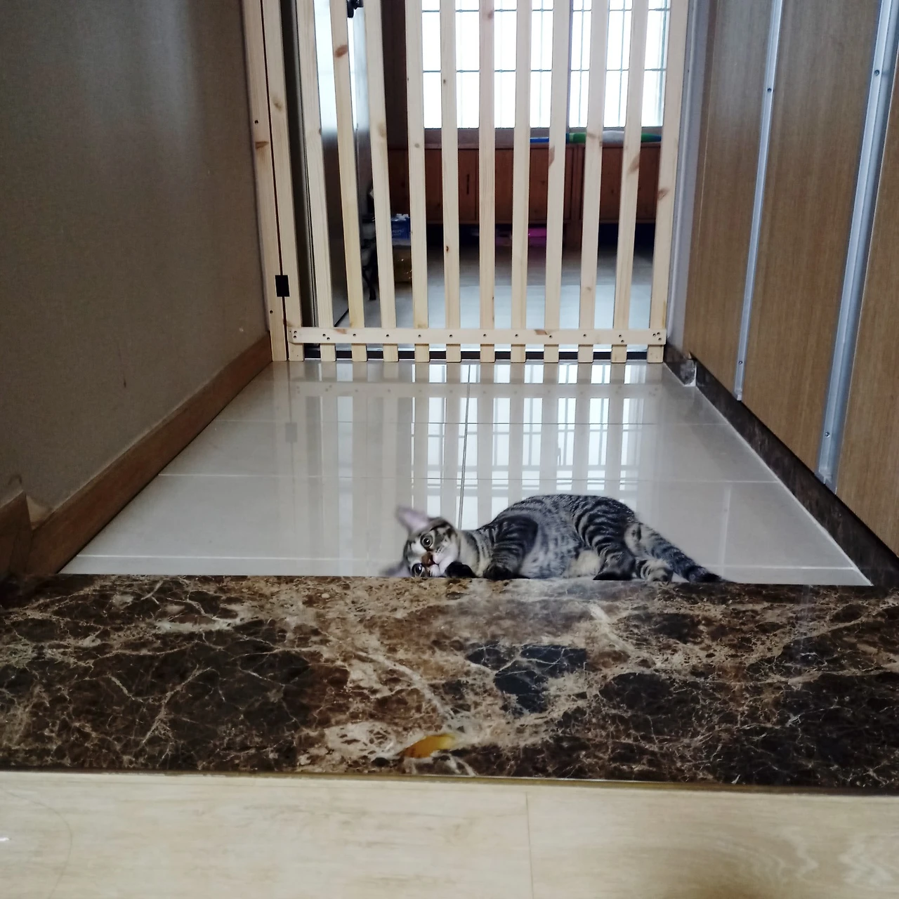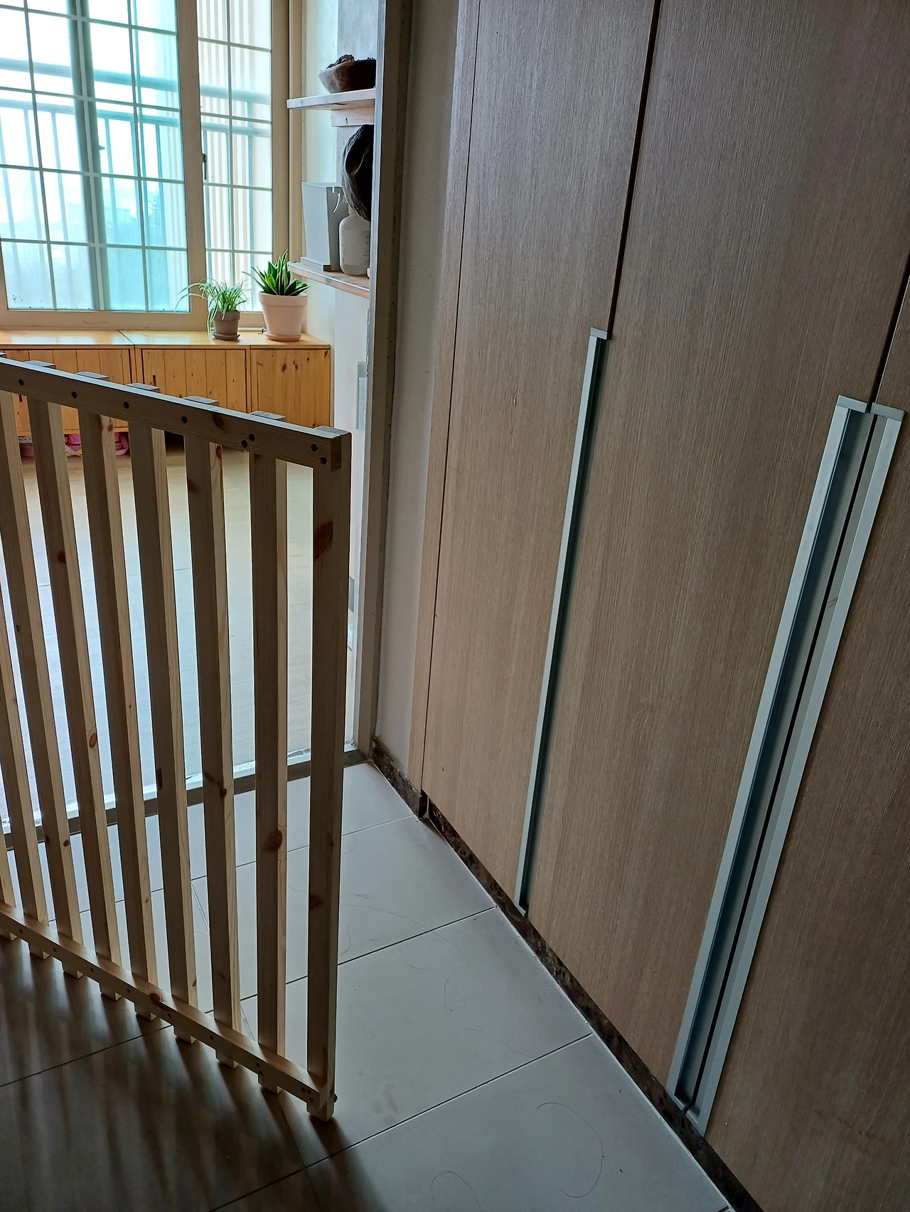 방묘문을 만들어 놓고 보니 '송이 가출 방지' 외에도 유용한 면이 참 많아요. 요즘 같은 장마철엔 젖은 우산이며 신발이며 현관이 질척한데 문을 닫아놓으니 송이가 근처에 갈 일이 없어서 좋고요. 무엇보다도 울타리가 주는 효과 같은 게 있더라고요. 든든하니 마음의 안정이 되네요. 그리고 살짝 인테리어 효과도 있지 않나요? 집 분위기와도 어울리는 듯 제 눈엔 꽤 괜찮아 보여요.
