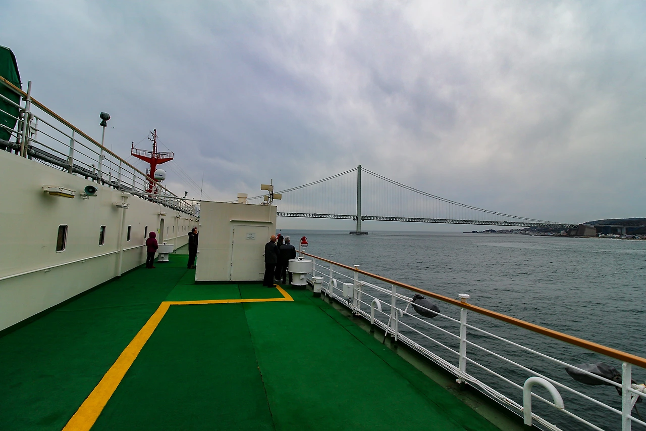 선실 스피커로 나오는 안내방송은 나를 깨운다. 패딩만 걸치고 밖으로 나가봤다. 느낀 건 현수교가 상당히 길었고 밖이 추웠다. 다시 방으로 들어와 잠을 잤다.