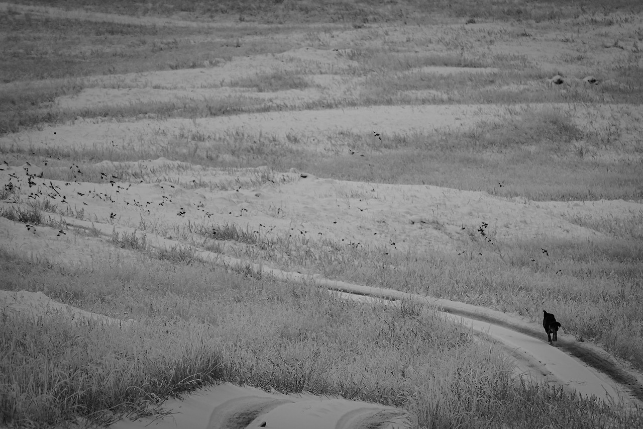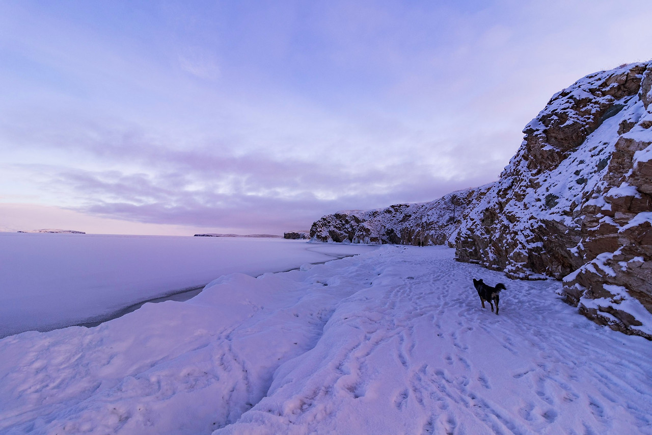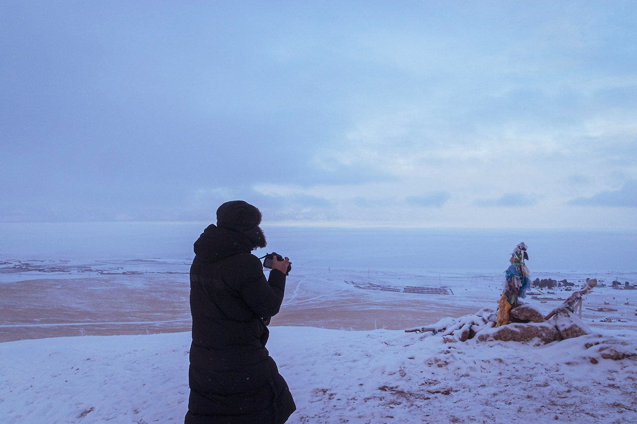 굴곡진 길을 지나 정자가 처량하게 있는 언덕 위를 올라갔다. 탁 트인 시야로 보이는 알혼섬이 신비롭다. 파란색의 하늘과 눈 덮인 호수와 땅 그리고 눈을 뚫고 올라온 노란색의 키가 작은 갈대 벌판. 게다가 '아즈만' 그곳을 뛰어다니니 장관이다. 시작부터가 좋다. 기사님은 15분 정도의 시간을 줬지만 더 오래 있었다.