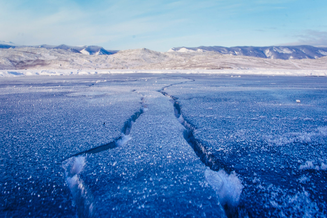 호수의 얼음과 얼음 사이의 갈라진 틈