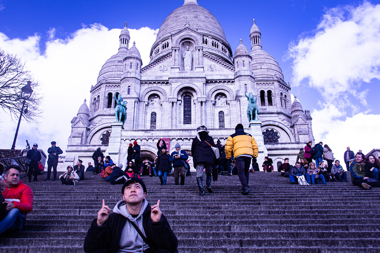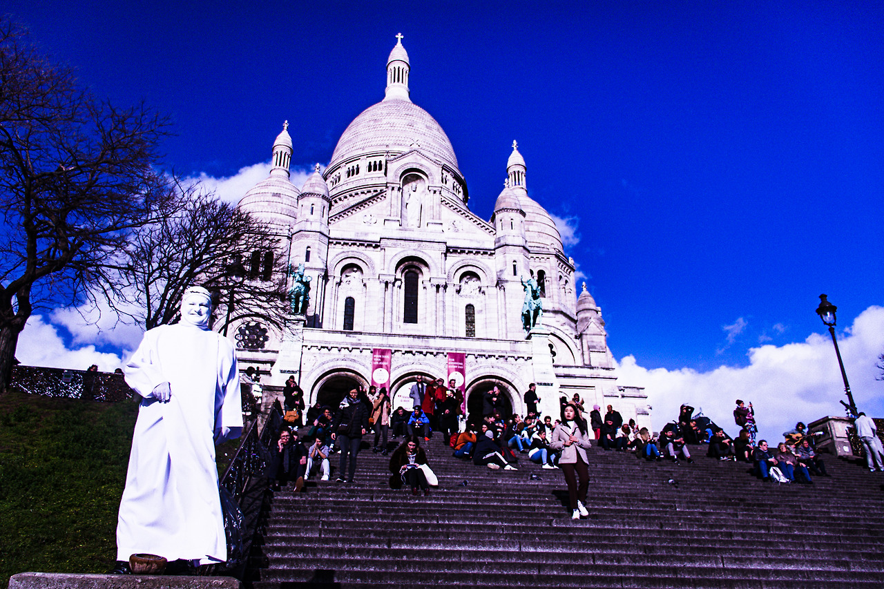 언덕에 도착할 때쯤부터 한국인들의 목소리가 들린다. 날은 춥지 않아 좋았다. 성당에 도착하니 사람들이 적당히 붐빈다. 이런 게 나는 좋다. 앞에는 파란 하늘과 하얀 성당이 있고, 뒤로는 파리 전경이 한눈에 보인다. 이래서 몽마르뜨 몽마르뜨하는 건가 싶다. 성당 밑에 하얀색으로 조각상을 따라한 아저씨가 보였는데 사진을 찍었다. 정말 친절하게 사진을 찍혀줘서 돈을 조금 주려고 했는데 괜찮다며 자신은 일을 한 것뿐이라고 한다. 멋있습니다 아재.