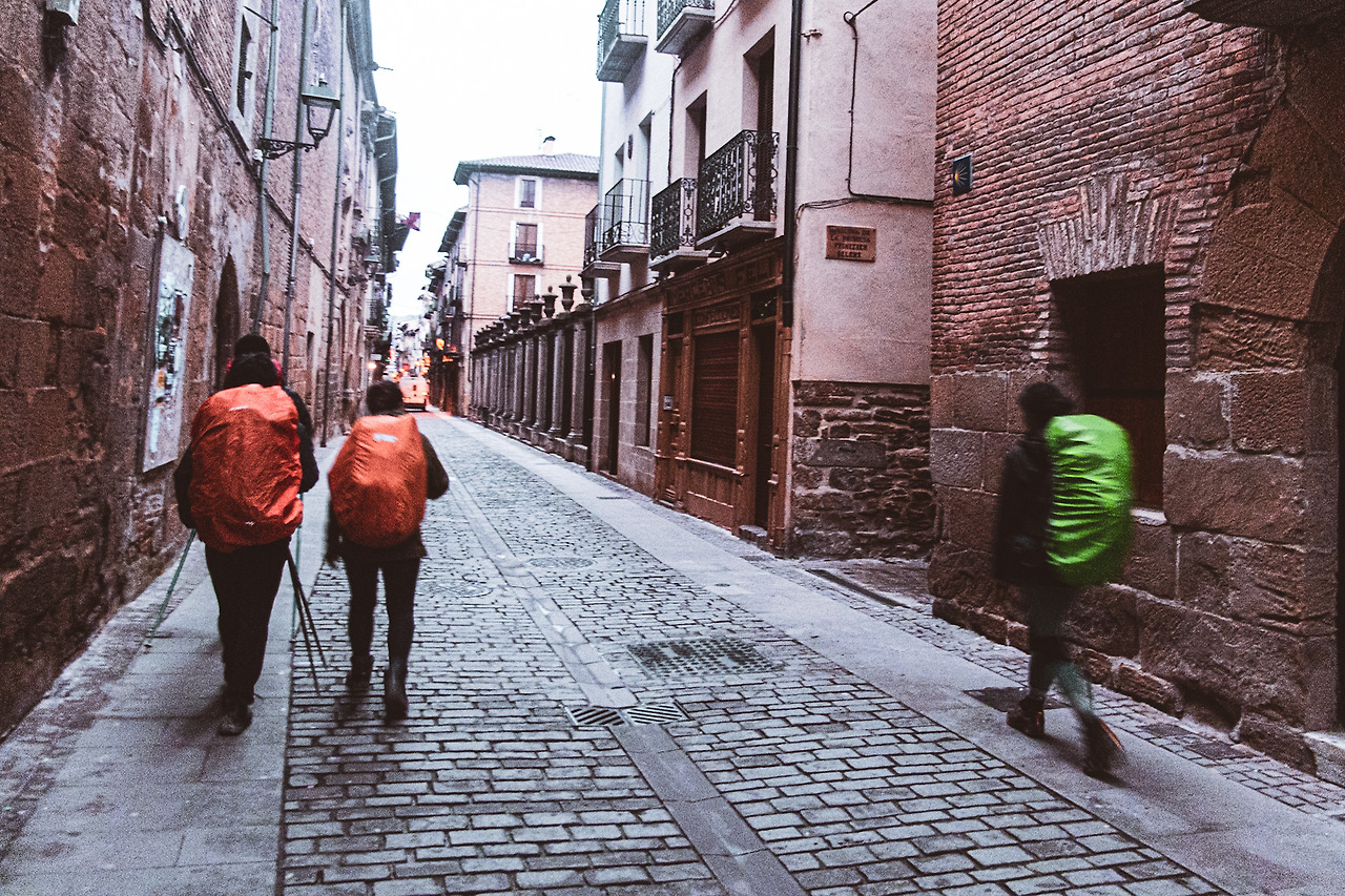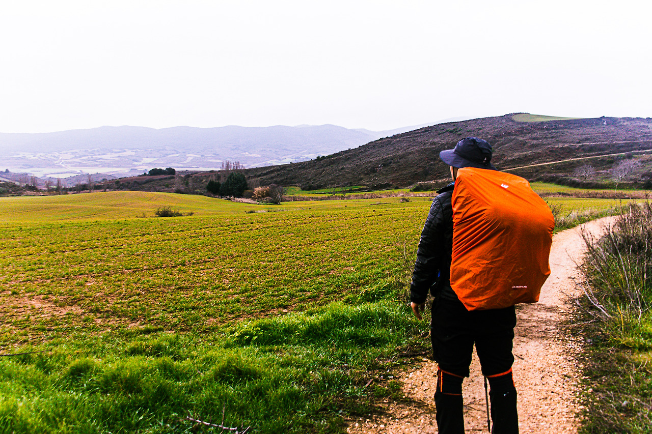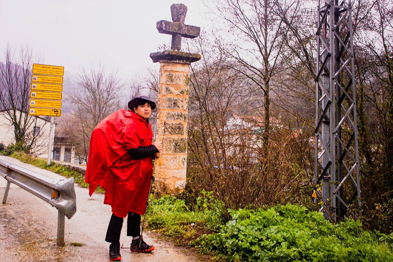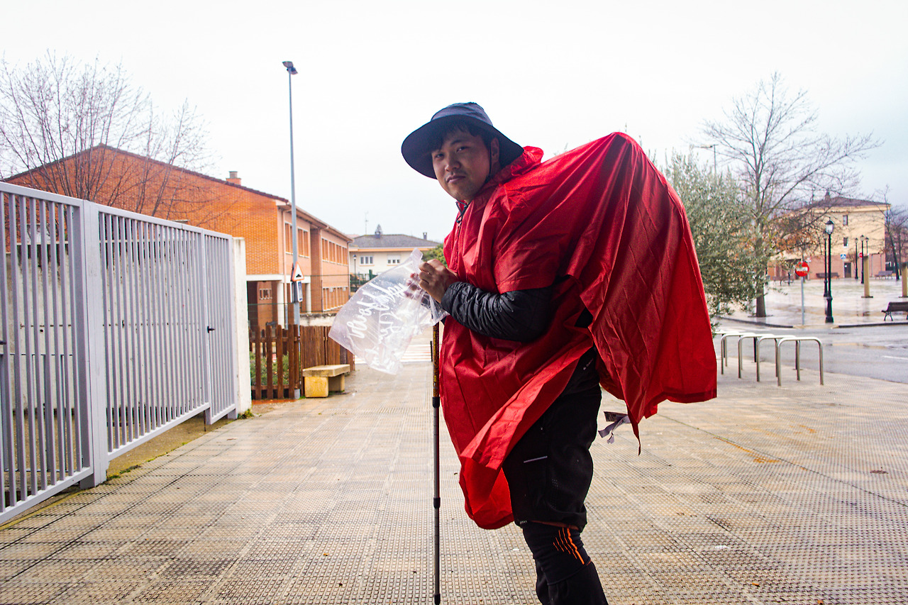 우중충한 하늘 아래를 걷고 있었다. 비가 한두 방울씩 떨어진다. 이내 비는 거세진다. 그냥 가려고 했지만 도저히 안될 것 같다. 큰 빌딩 밑으로 들어가 판초우의를 꺼내 입었다. 진짜 순례자 느낌이 나서 사진도 한 장 찍었다. 오늘 목적지의 초입에 왔다. 근처에 주유소가 있었다. 그곳에 딸린 슈퍼를 지나치는데 창문으로 나무 지팡이가 보인다. 전부터 사려고 했던 것인데 이제야 발견했다. 냉큼 들어가서 하나 구입했다. 여태 유하의 등산스틱을 하나 빌렸는데 이제 다시 돌려줬다. 지금까지 빌려줘서 고마웠다.