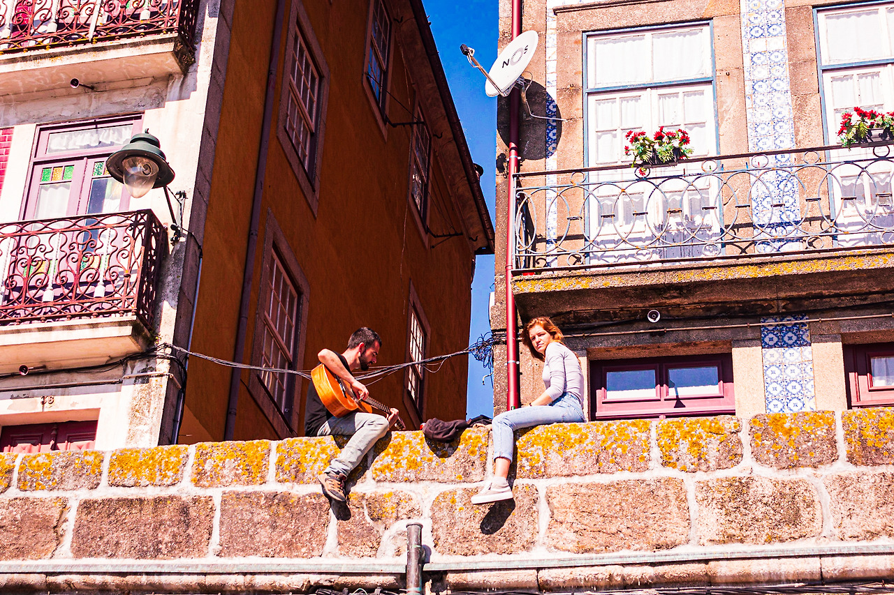 난간에 걸터앉아 음악을 하는 남녀