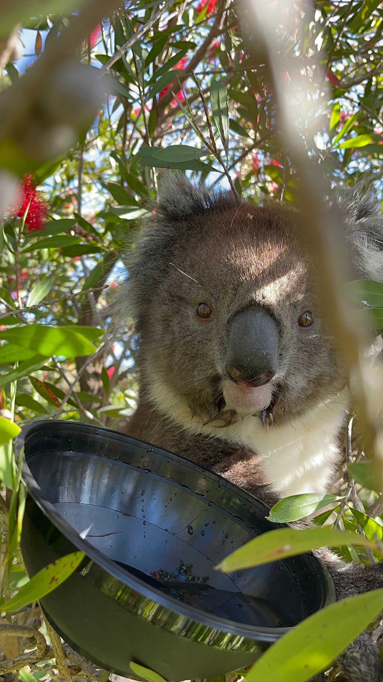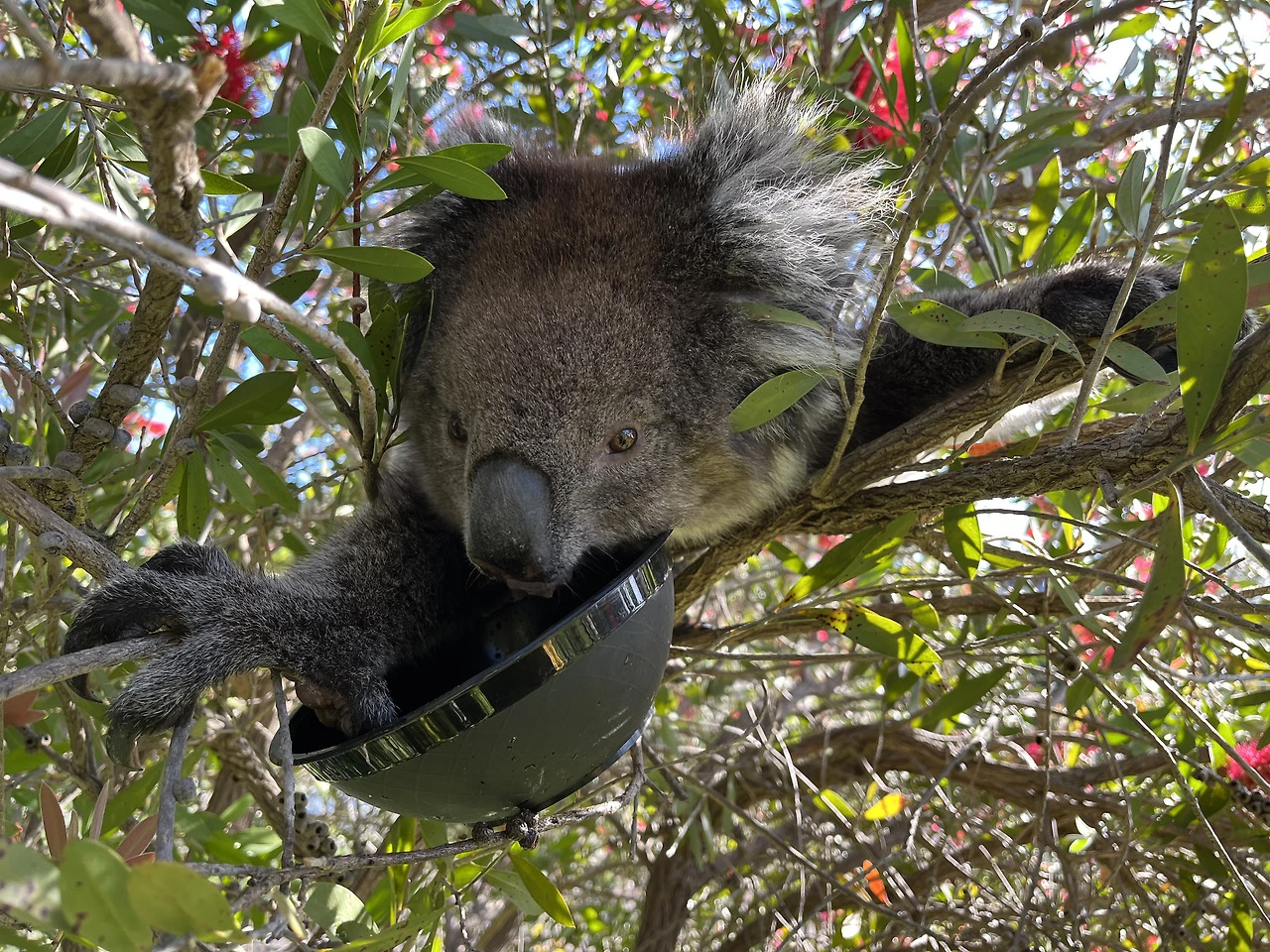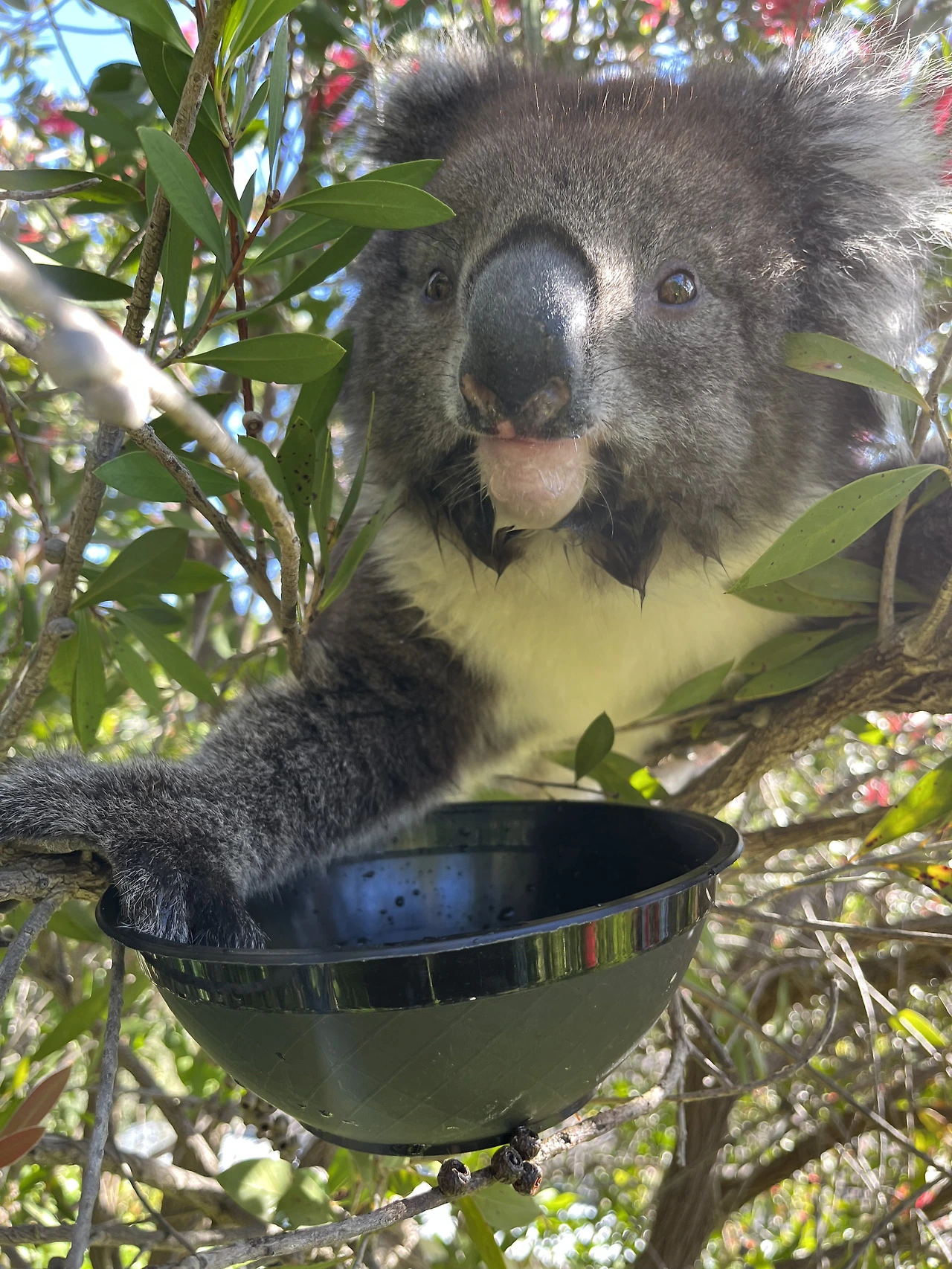 빨간 꽃잎 사이에 있는 코알라의 모습은 유칼립투스나무에 있는 흔한 모습과 대조적으로 그 풍경이 독특하기도 하거니와, 낯선 사람이 주는 물을 벌컥벌컥 마시는 모습이 너무 귀여워 폰 카메라로 그 모습을 담아두고 있었어요. 그 찰나 코알라가 팔을 쭉 뻗어 제 폰을 향해 빠르게 다가왔어요.