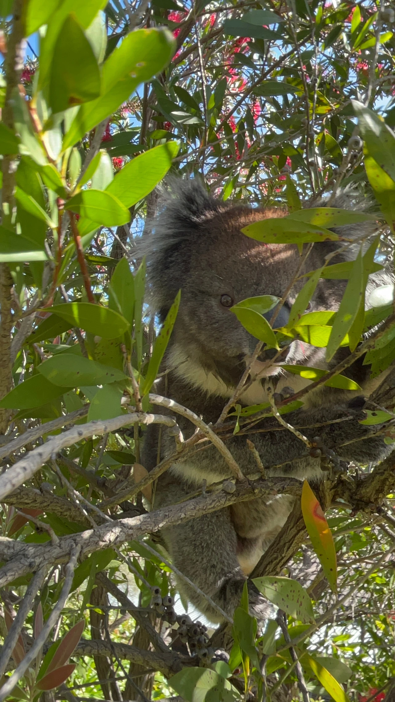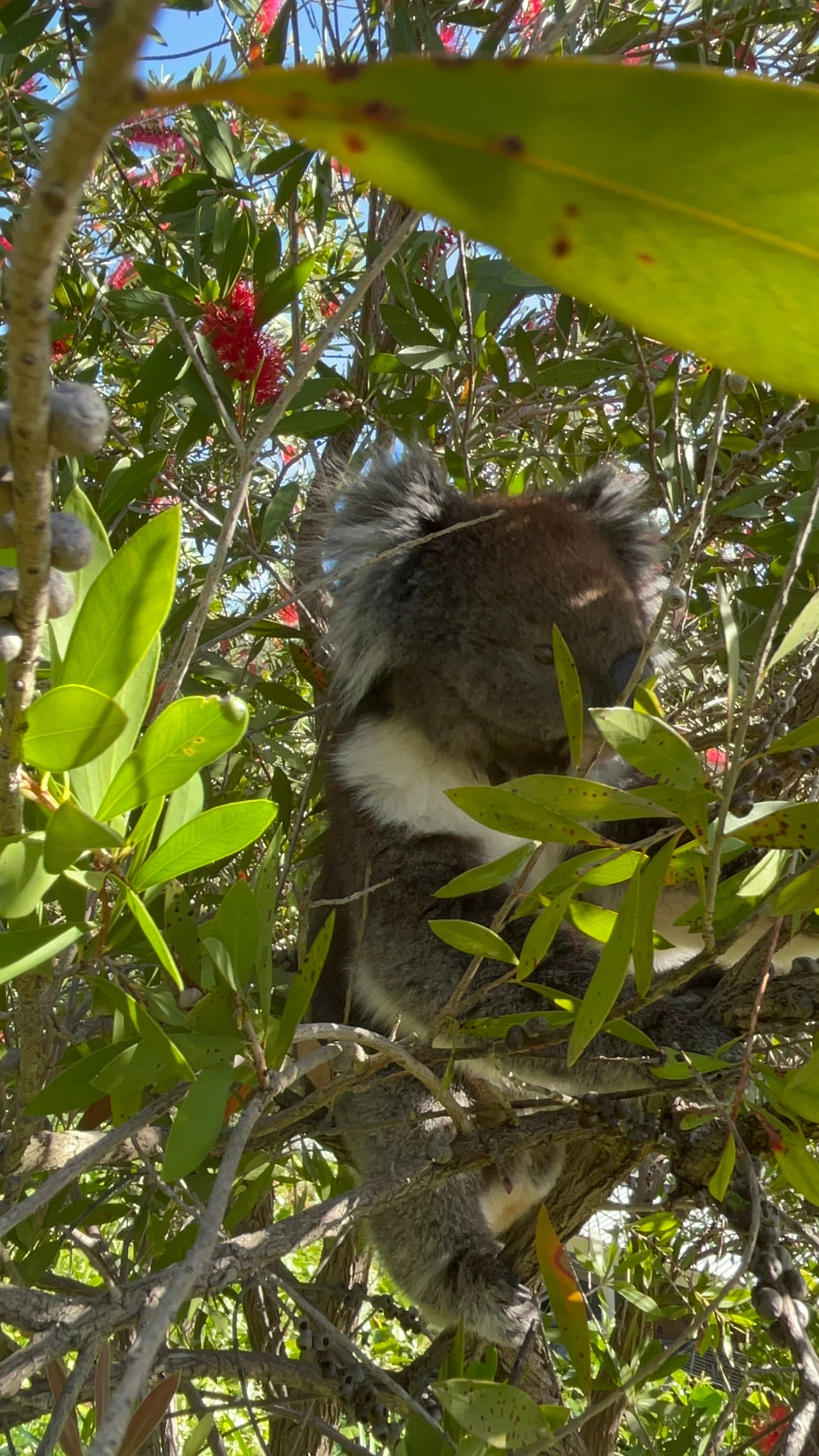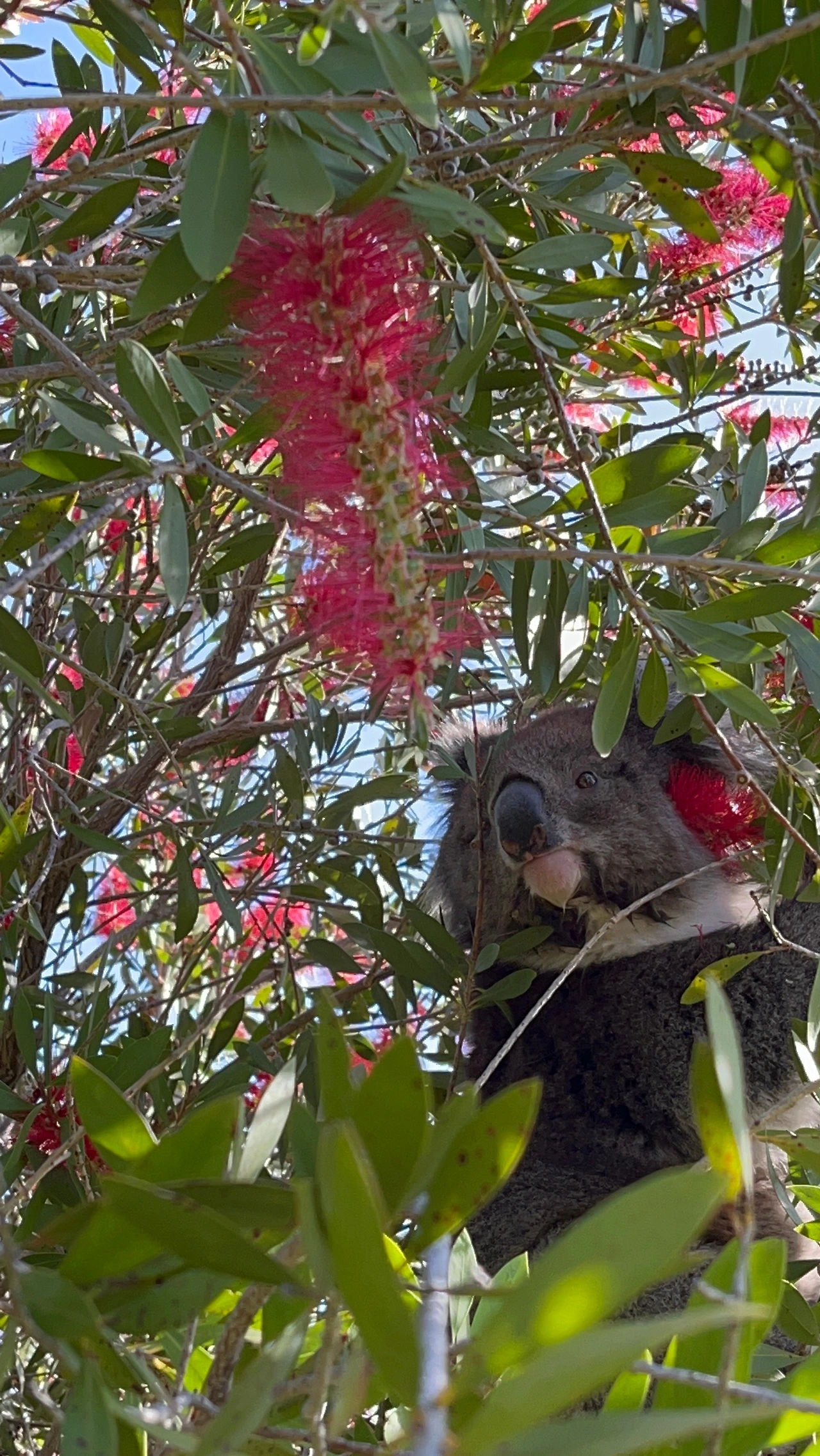 빨간 꽃잎 사이에 있는 코알라의 모습은 유칼립투스나무에 있는 흔한 모습과 대조적으로 그 풍경이 독특하기도 하거니와, 낯선 사람이 주는 물을 벌컥벌컥 마시는 모습이 너무 귀여워 폰 카메라로 그 모습을 담아두고 있었어요. 그 찰나 코알라가 팔을 쭉 뻗어 제 폰을 향해 빠르게 다가왔어요.