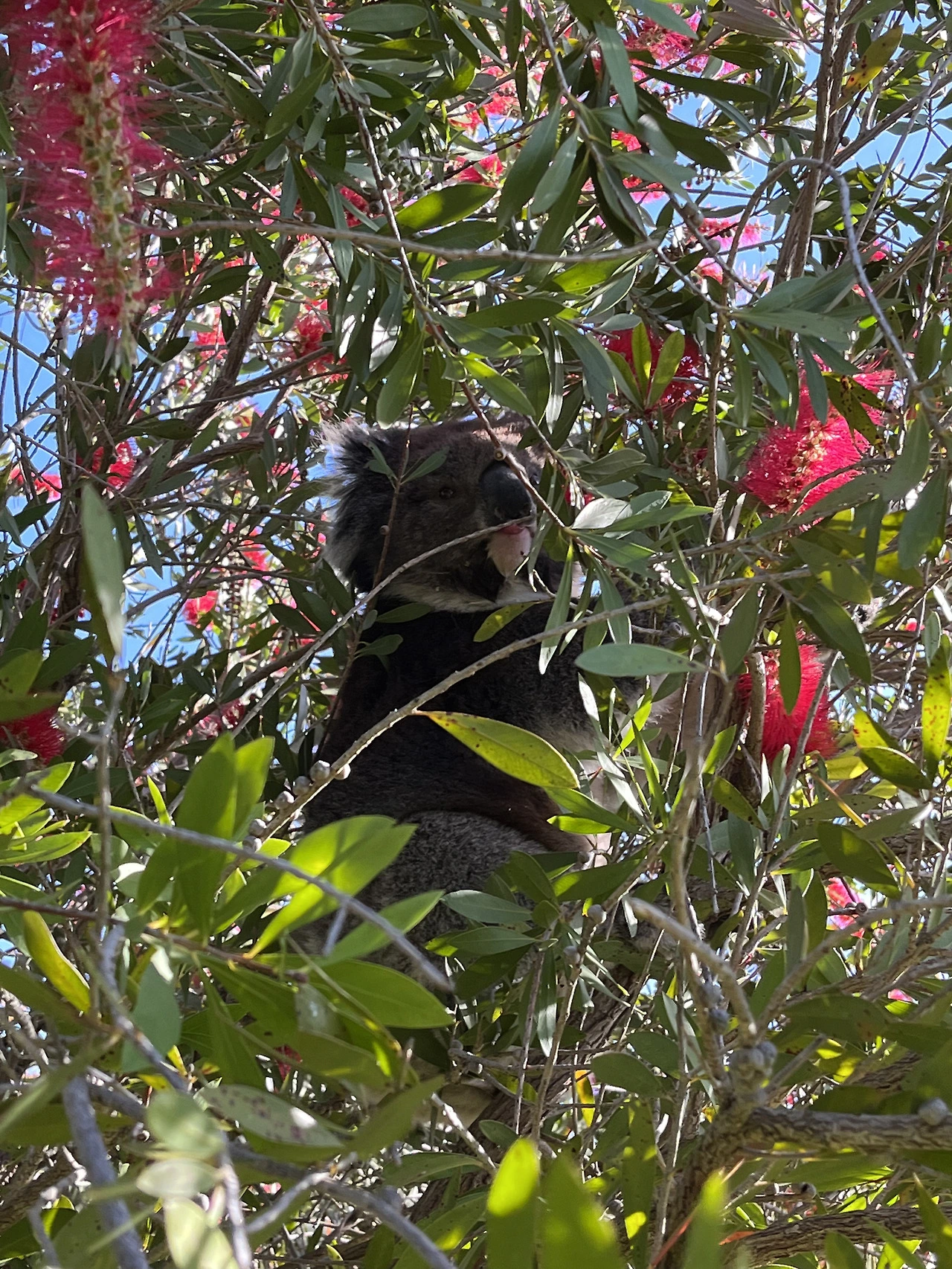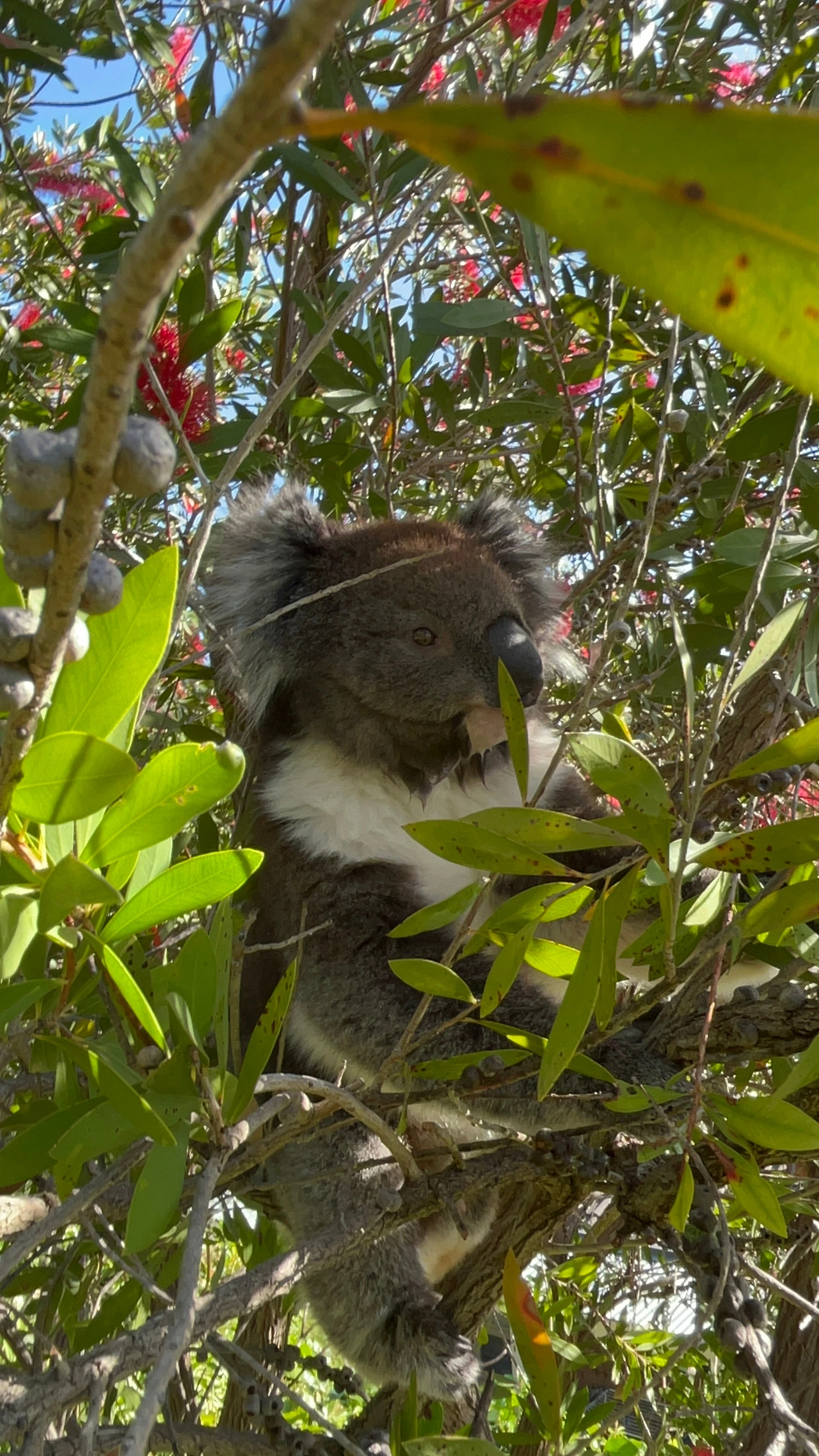유칼립투스가 아닌데 병솔나무의 빨간 꽃잎을 조금씩 오물오물 씹고 있었답니다.