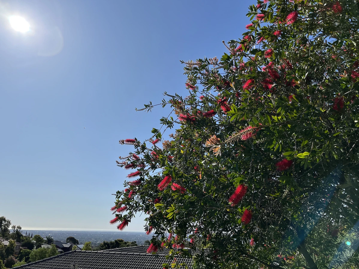 그 나무는 바틀브러시 나무, 병을 청소하는 솔처럼 생겼다 하여 한국에서는 병솔꽃이라도 불리는 빨간 꽃을 피우는 나무입니다. 일 년에 한 철 파란 하늘 아래, 푸른 잎들 사이에 얇고 빨간 붓점을 찍어내는 듯 예뻐 보여 보고 있노라면 흐뭇한 광경이었죠.