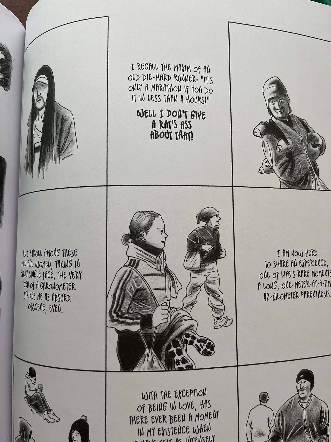 책은 프랑스 노르망디에 사는 한 남자의 뉴욕 마라톤 도전기이다. 세바스챤 삼손이라는 이름의 저자는 미술선생님이기도 하여 그의 여정을 만화로 담았다. 그가 도전한 해는 2011년이다. 지금으로부터 15년 전의 경험이다. 그렇지만 첫 마라톤에 도전하는 여정에서의 어려움, 감정과 감동은 세상이 급변하고 과학이 극히 발전했다 한들 한 인간으로 느끼는 육체적 정신적 경험들은 세월과 무관한 경험이라 공감할 수 있다. 그도 자신감 없음과 고독을 즐긴다는 두 가지 이유로 러닝 클럽이나 크루에 속하지 않고 자연에서 혼자 연습을 시작했다. 처음 달리기를 할 때 저항하는 신체적 고통을 만화로 그려내어 재미있기도 하고, 초보들이 흔히 겪는 발과 무릎의 부상들로 인해 스포츠 의사나 척추교정사, 발교정사 등을 만나는 장면들도 남의 이야기가 아니었다.