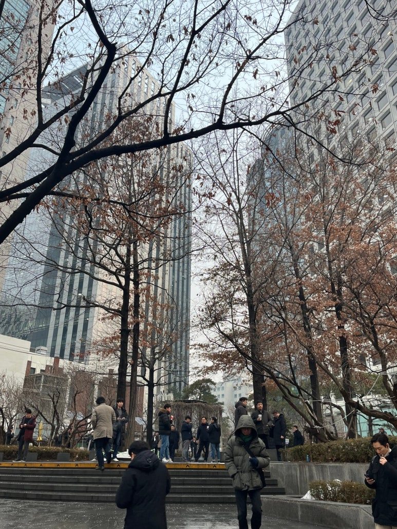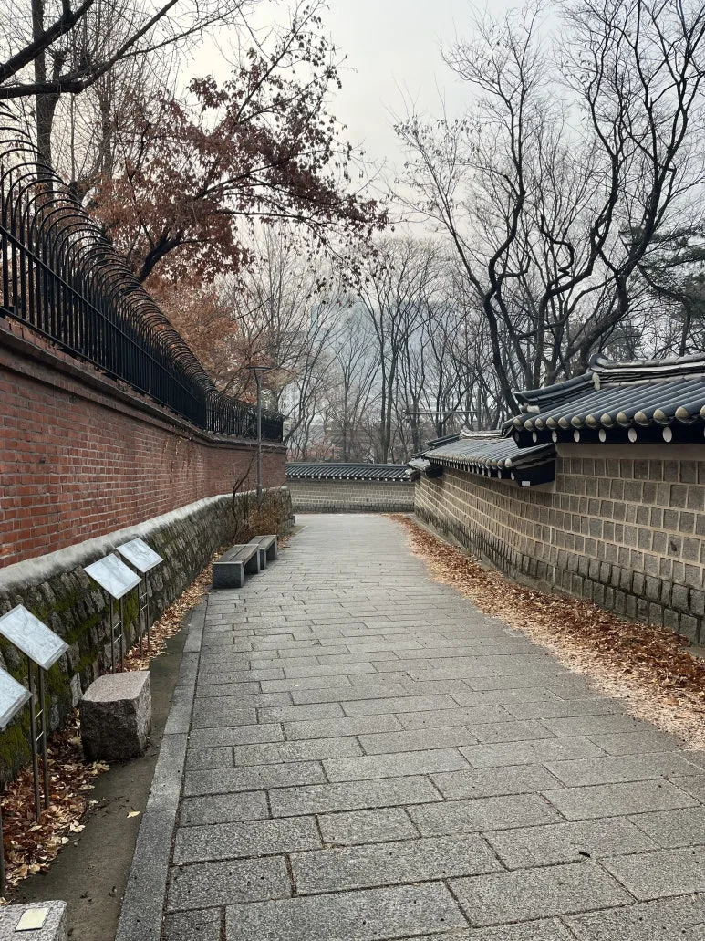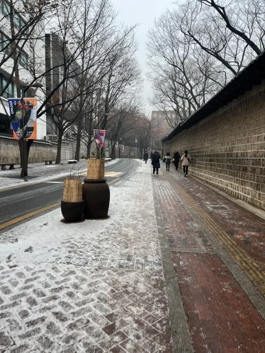 덕수궁과 돌담길은 여전히 조용히 있었다. 그러나 24년 12월에 일어난 비상계엄 사건으로 돌담길은 경찰차로 둘러싸여 있었다. 미국대사관 앞은 삼엄한 경계, 그 앞을 유유히 프로페셔널한 러너처럼 달려 지나가고 싶었으나 그 얕은 오르막도 벌벌 기었다. 그 경찰차 내 대기조들에게 큰 볼거리가 아니었을까싶다. 실상은 두 다리로만은 도저히 미끄러워 돌담길을 한 팔로 짚고 가야 하는 흑역사를 만들었다고나 할까.