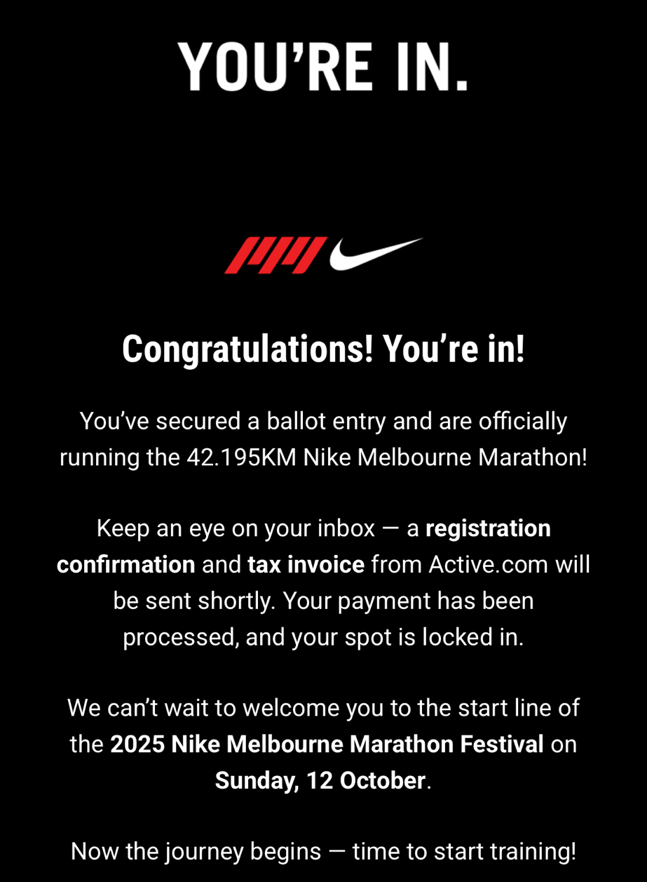 올해, 호주 여러 도시의 마라톤 접수는 일찌감치 마감됐다. 멜버른 마라톤도 이미 ‘솔드아웃’. 그러던 어느 날, 멜버른 마라톤이 추가 추첨을 잠시 연다는 소식이 떴다. 기대도 없이 신청했는데, 결과 날에 이메일을 열자 믿기지 않는 문구가 있었다.