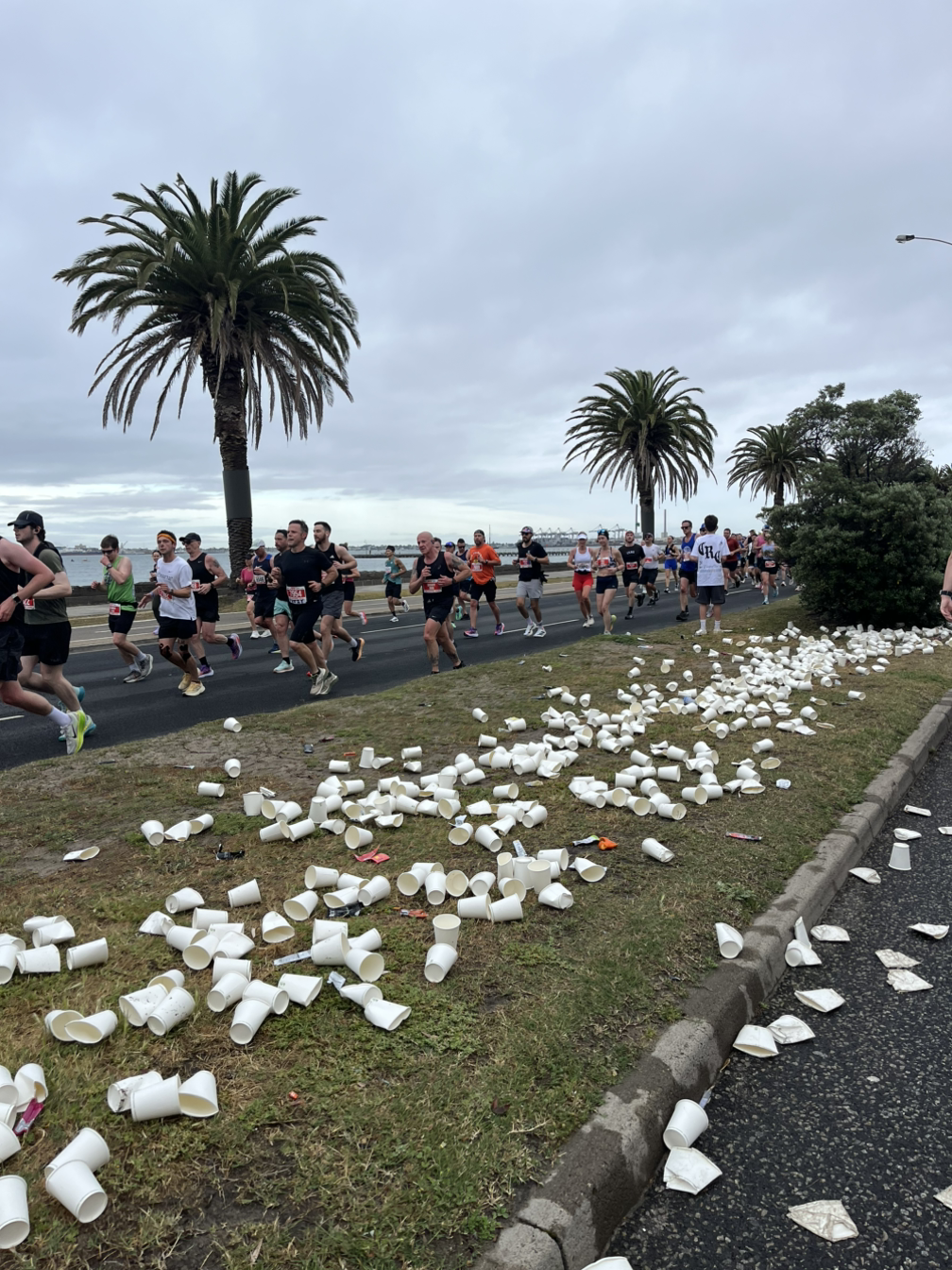그랬다. 달씨의 42.195Km는 여러 굴곡점이 있었다. 초반 여유 있게 페이스를 잘 지키며 시작했다. 햄스트링에 온통 신경을 썼지만, 사실 첫 번째 복병은 복부경련이었다. 버려지는 물컵들로 환경에 너무 미안했지만, 물보급 지점마다 물은 꼭 챙겨마시는 달씨가 3번 혹은 4번째 물을 마셨을 때 배에 스티치가 일어났다.