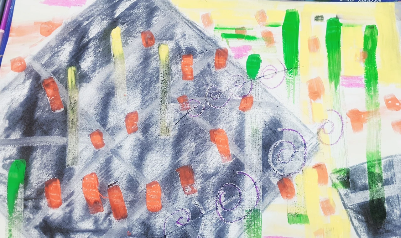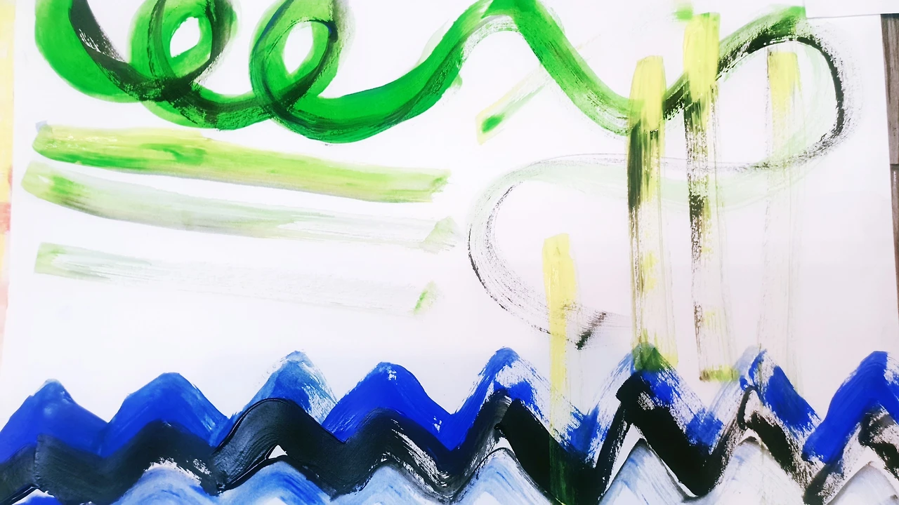 들려오는 음악에 따라 느껴지는 대로 재료를 고르고, 감정의 흐름대로 선과 점, 도형으로 표현해 보라고 하셨다.