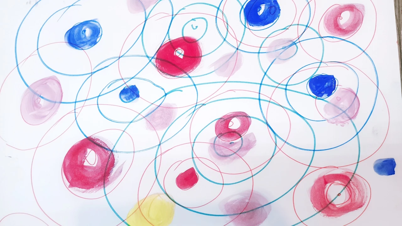 동그라미 두 개만 봐도 눈 같다고 표현하는 우리들. 머릿속으로 이미지화하는 과정은 버리고 즉흥적인 움직임에 따라갈 것, 어린아이가 그리는 난화와 같이 자유롭게 표현해 보라고 하셨다. 내 멋대로 그리고 칠하는 가운데 긴장감은 어느새 서서히 녹아내렸다.