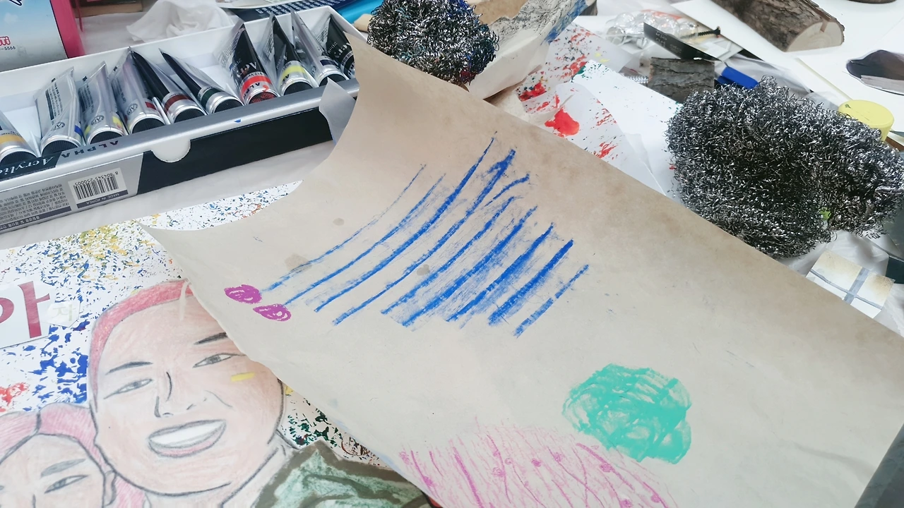 색칠한 그와 나를 오리고 붙이며 새로운 종이를 만났다. 어렸을 때 엄마가 부엌에서 탄 냄비 닦을 때 쓰셨던 철 수세미가 도구로 변신했다. 물감을 묻혀 꾹꾹 누르니 오! 느낌 있네.