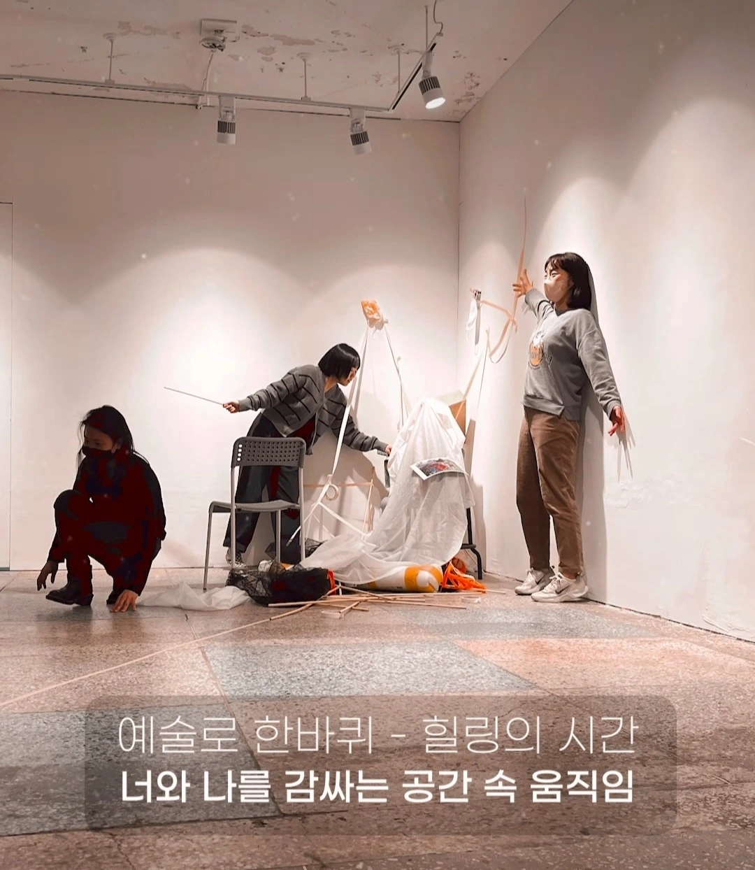 느리게 움직이며 6가지 인사를 나누다 보니 오! 이거 참 느낌 있네. 그저 천천히 돌며 인사 나누다가 선생님과 다른 몇몇 참여자의 움직임이 다름을 느꼈다. 진짜 무중력 상태에서 움직이는 것 같았다. 흐느적보다는 절제된 움직임이다. 그 모습이 가볍고 자유롭게 느껴졌다. 춤추는 느낌.