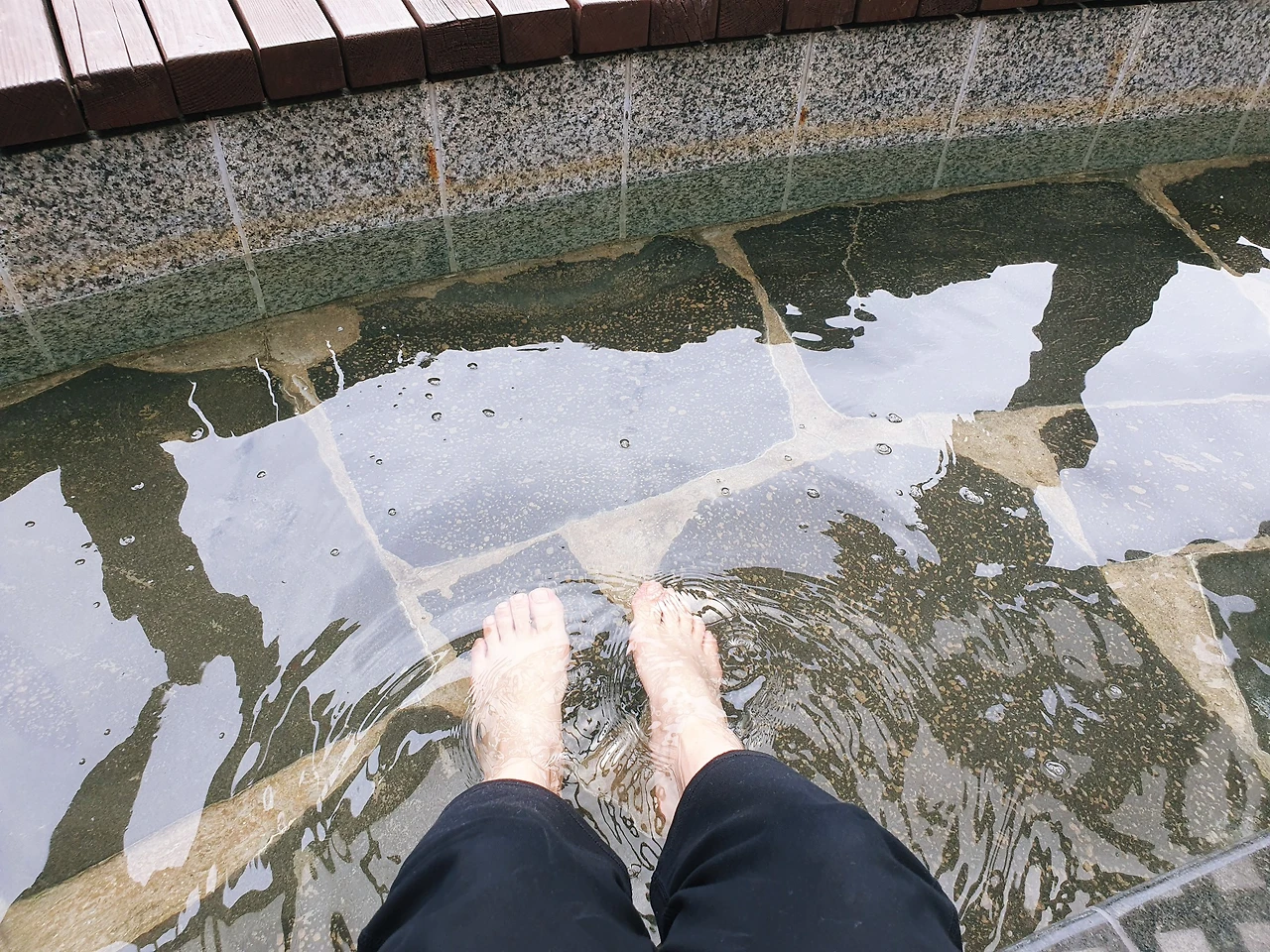 실외 자리를 잡고 등을 살짝 기대었다. 물이 생각보다 뜨거워서 놀랐다. 발만 담그고 앉아 있는데 위로받는 느낌이다. 멍 때리고 멀리 바라보고 있었다. 20분 정도 족욕을 하고 주위를 조금 더 걸어본다.
