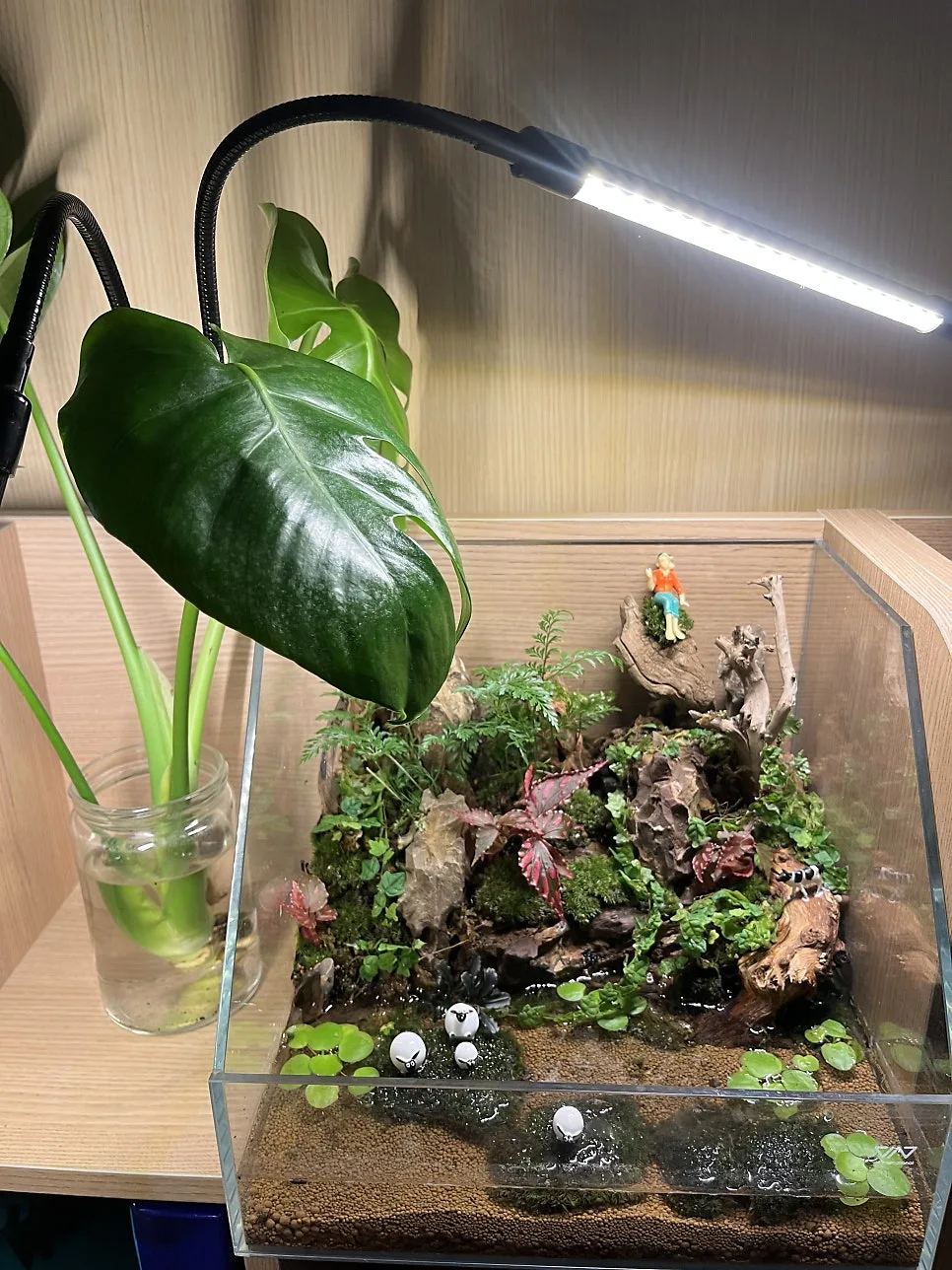 사장님한테 어항을 보여드리면서 여건을 설명드리니 적당한 물고기를 추천해주셔서 다섯마리를 데려왔다. 테라리움을 어항처럼 구조를 바꾸고 식물도 더 심고 약처리를 한 물을 채운뒤 물고기를 이사시켰다. 물고기들은 새집을 이리저리 탐색하면서 잘 움직였다. 몇시간뒤 다시 보니 두마리가 안보여서 한참을 찾았는데 테라리움의 바위 틈새로 들어가서 그림자 속에서 쉬고있는 거였다. 너희도 혼자만의 시간이 필요하구나.