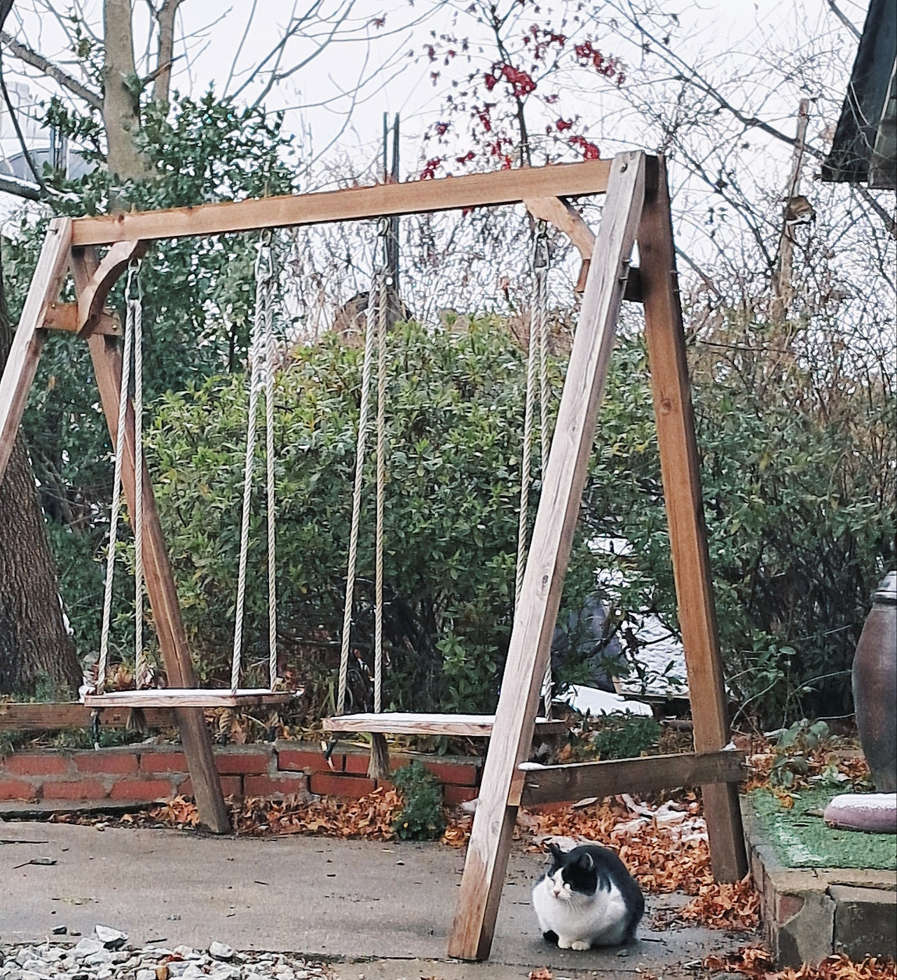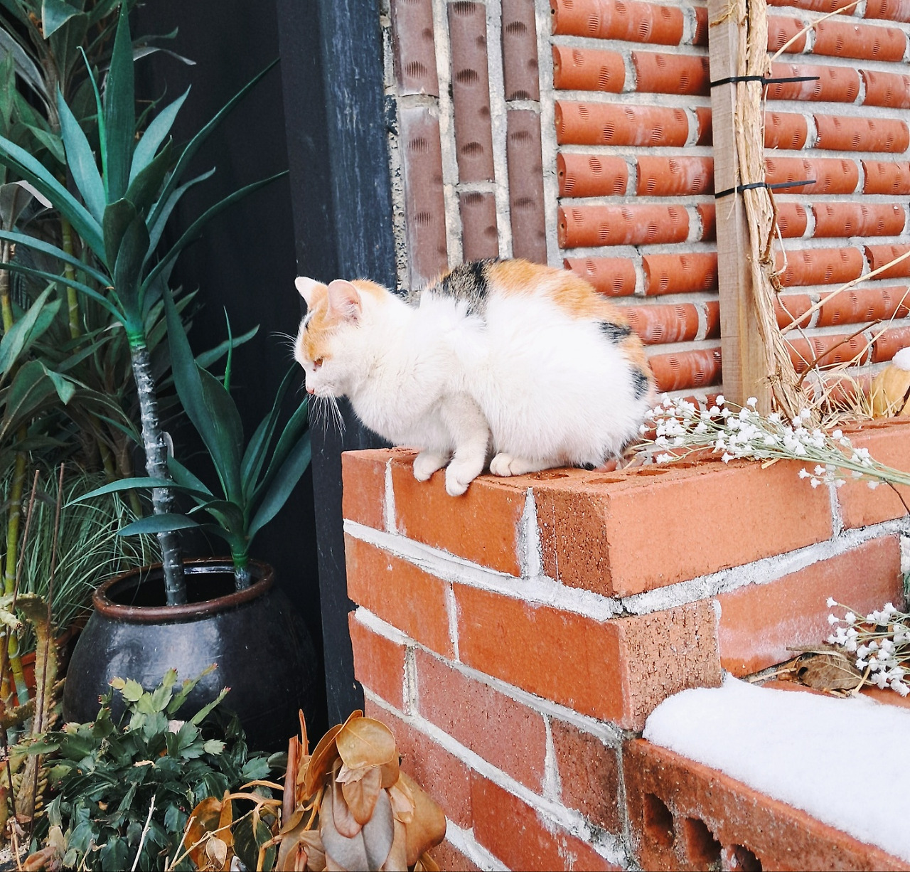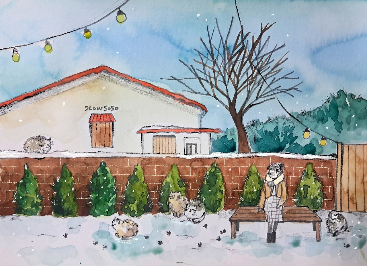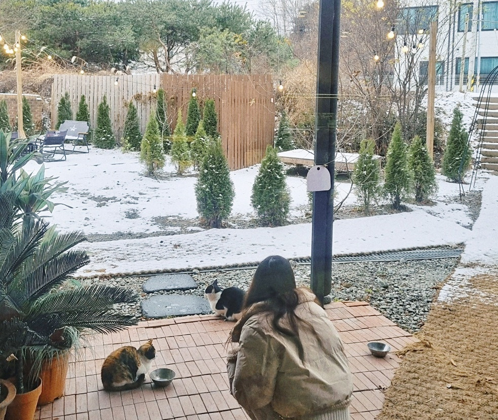 귀여운 걸 보면 마음이 정화된다는 말이 딱 맞다. 왜인지 고양이는 내게 그런 생명체였다. 서툰 이별에 힘겨워할 때도 자연스레 고양이 영상을 찾았던 걸 보면. 슬픈데도 웃고, 울면서도 보고- 가만히 있어도 사랑스러운 그들에게 유달리 마음이 갔다. 그래서일까, 눈이 포슬포슬 내렸던 토요일 오전에도 소소한 행복을 맞닥뜨렸다. 차 타고 저 끝까지 들어가야 만날 수 있는 진천 외곽의 한 카페. D군과 첫 손님으로서의 여유를 즐기던 중, 문밖에 모여있는 고양이 가족을 마주쳤다. 문이 열리기 전에는 호기심 가득한 눈빛으로 모여들지만, 문을 열고 조금이라도 가까이 가면 잽싸게 도망간다. 이 정도면 괜찮은 거리이려나 싶어 일정 간격을 유지하니, 점차 그들도 자리를 잡고 앉았다. 보이지 않게 단상 아래로, 눈이 소복하게 얹은 흔들 그네 곁으로, 그 사이로 조용히 문 옆에 수그려 앉은 나도. 그저 바라보는 것만으로 고요해진다.