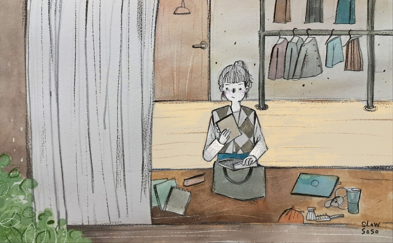 플래너와 일기장, 스케치북과 필통, 빠질 수 없는 이어폰까지. 더 챙길까 했지만 이내 뻗은 손을 거두고 짐을 덜어냅니다. 욕심을 부리면 마음도 무거워지니까요. 목적지는 공주, 본가에서 버스로 1시간 10분 정도가 걸리는 곳입니다. 시간이 남아 빨래방에 들리기로 했어요. 묵은 때가 가득한 이불을 세탁기 안에 넣으니 거침없이 돌아가기 시작합니다. 지켜보는 중에 문이 열리고 누군가 들어왔어요.