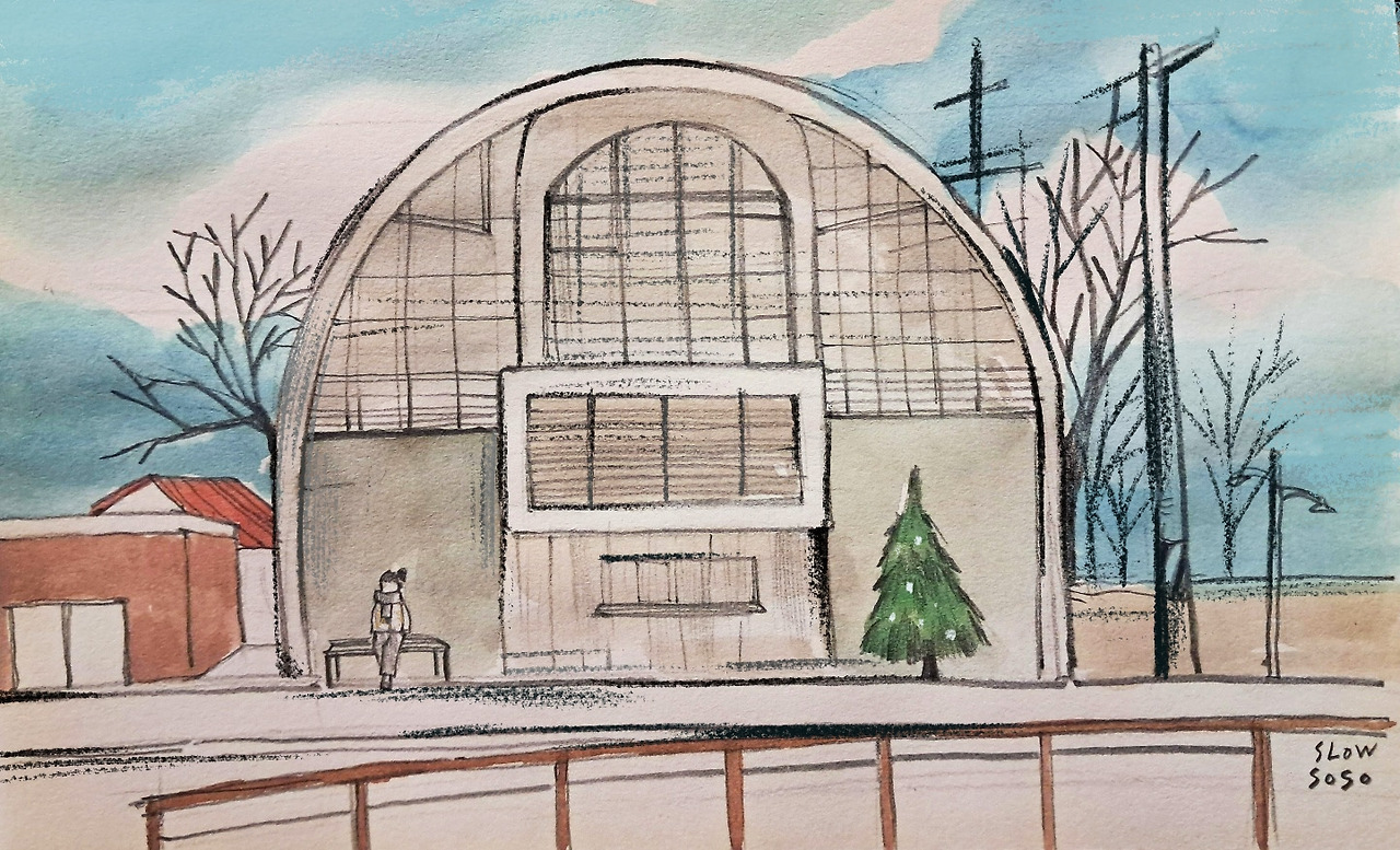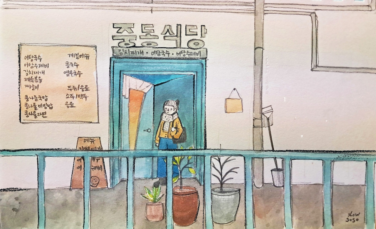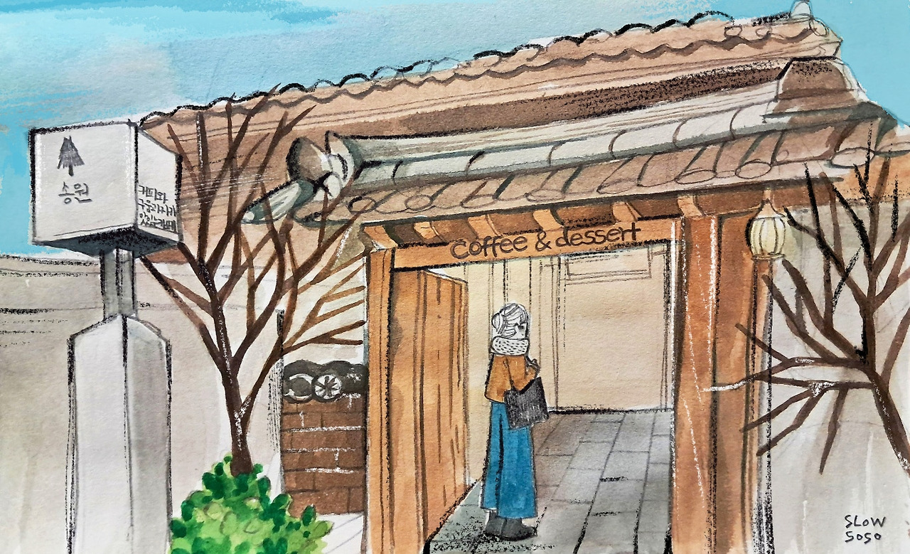 기와지붕을 따라 고즈넉한 분위기가 돋보이는 카페로 들어갔습니다. 한결같은 취향이 이끈 곳, 이곳은 카페 <송원>입니다. 공주에는 밤이 유명하다고 해요. 그만큼 밤 마들렌을 먹어보고 싶었으나, 아쉽게도 품절입니다. 그도 그럴 것이, 이미 몇 개의 테이블이 꽉 차 있습니다. 서둘러 2층 구석에 자리를 잡았지요. 좌식인지라 신발을 벗고 들어가는 점이 정겹습니다. 눈에 띄는 건 창문 너머로 빼곡히 들어서 있는 가옥이에요. 저 멀리 보이는 집들에도 주인이 있겠지요. 지금 이 시각은 내가 모르는 누군가에게도 똑같이 적용되고 있을 거고요. 한 해의 마지막이 모두에게 무사히 지나가도록 바랐어요. 탈 없이 견뎌 내일을 맞이하게끔 말입니다. 그렇게 일기 몇 줄을 쓰고, 그림 몇 장을 그리며 창밖을 내다봅니다. 주변의 말소리가 채워지고 비워지기를 반복할수록 하늘도 깜깜해졌어요.