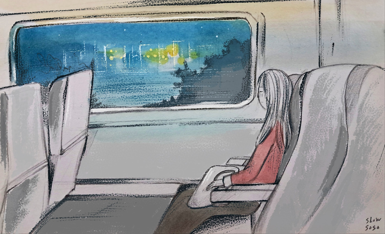 그렇게 한 시간이 지났을 무렵 한쪽에서 떠들석한 소리가 들려왔어요. 어딘가 경직되있던 조용한 분위기와는 다른 그림입니다. 고개를 들어보니 의자를 돌려 도란도란 이야기를 나누는 어르신들이 보였어요. 그 모습을 보니 뭔가 안심이 됩니다. 기차 안에서 삶은 계란 하나를 나눠먹던 친구들과의 추억이 떠올랐을까요, 어릴 적 상상하던 기차여행의 모습과 겹쳐서일까요. 내심 어색한 분위기에 긴장되있던 어깨가 풀립니다. 적당한 소음을 라디오 삼아 남은 시간을 맡겼습니다.