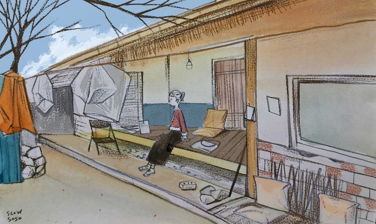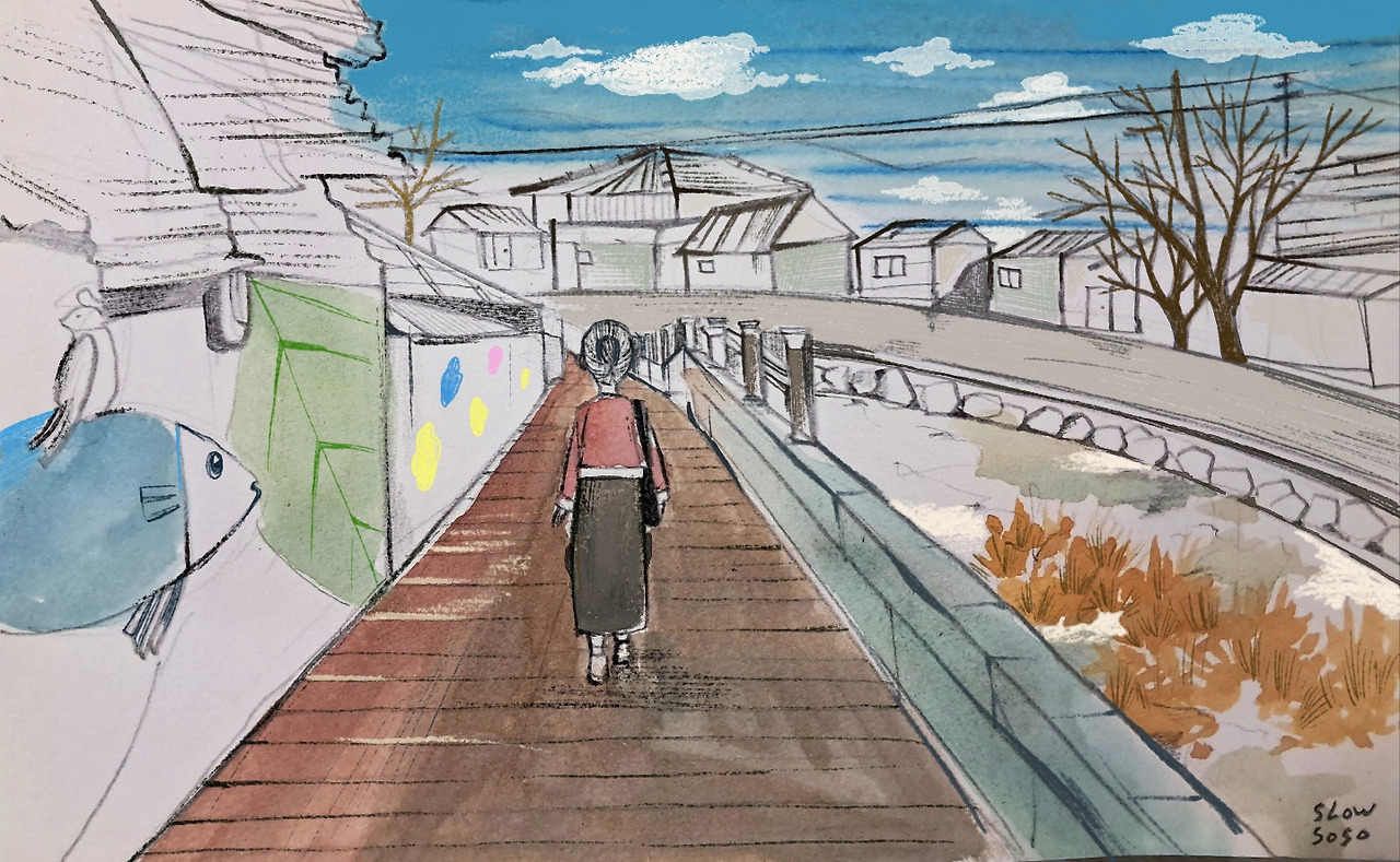 든든히 채운 배로 15분간의 산책을 즐기기로 합니다. 다음 목적지로 이동하는 동안 더 파래진 하늘이 눈에 띄었어요. 구름을 따라 뻗어있는 산이 유난히 선명해서 금방이라도 닿을 것 같습니다. 핸드폰 지도 하나에 온 마음을 의지하며 여차저차 나선 길. 쨍한 벽화가 그려진 낮은 담장이 보이면 마침내 도착입니다. <독립서점, 책방 로파이>