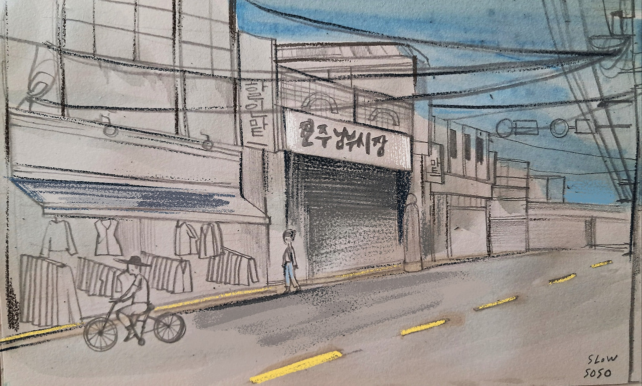 남부시장 부근의 골목길은 차량과 보행자의 거리가 매우 좁아요. 경적에 뒤돌아보면 마을버스가 코앞까지 와있기도 해서 흠칫 놀라 벽 쪽으로 몸을 붙이는 일이 잦았지요. 동네에 계신 어르신분들은 이와 같은 아침이 익숙하신 듯했어요. 자전거를 타면서 오는 차를 요리조리 피하시고는 골목 가게 사장님들과 인사를 주고받으십니다. 맺힌 땀을 바삐 닦으면서도 가는 길이 멀게 느껴지지 않은 건 이런 풍경이 좋아서였을 겁니다.