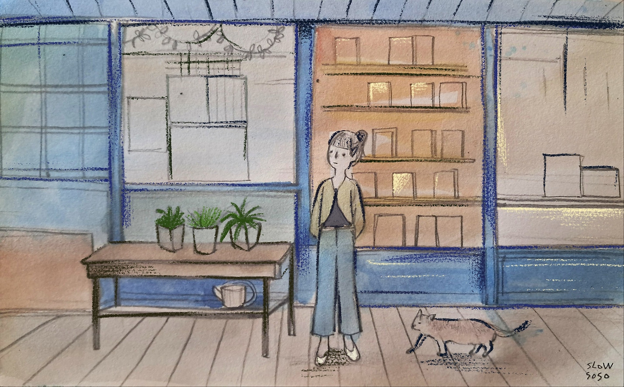 설레는 마음으로 올라와 본 풍경은 예상보다 훨씬 한적하고 조용합니다. 사람이 잘 다니지 않는 시간대기에 대부분의 문이 닫혀 있으면서도 오랜 시간 묻어난 정은 가려지지 않았습니다. 인기척이 느껴지지 않는 길을 탐방하다 보니 그 끝에 노란빛을 내뿜고 있는 작은 책방이 보였습니다. 들어가자마자 웃음을 지은 건, 책 옆에 자리한 고양이의 뒷모습이 너무 포근해서예요.
