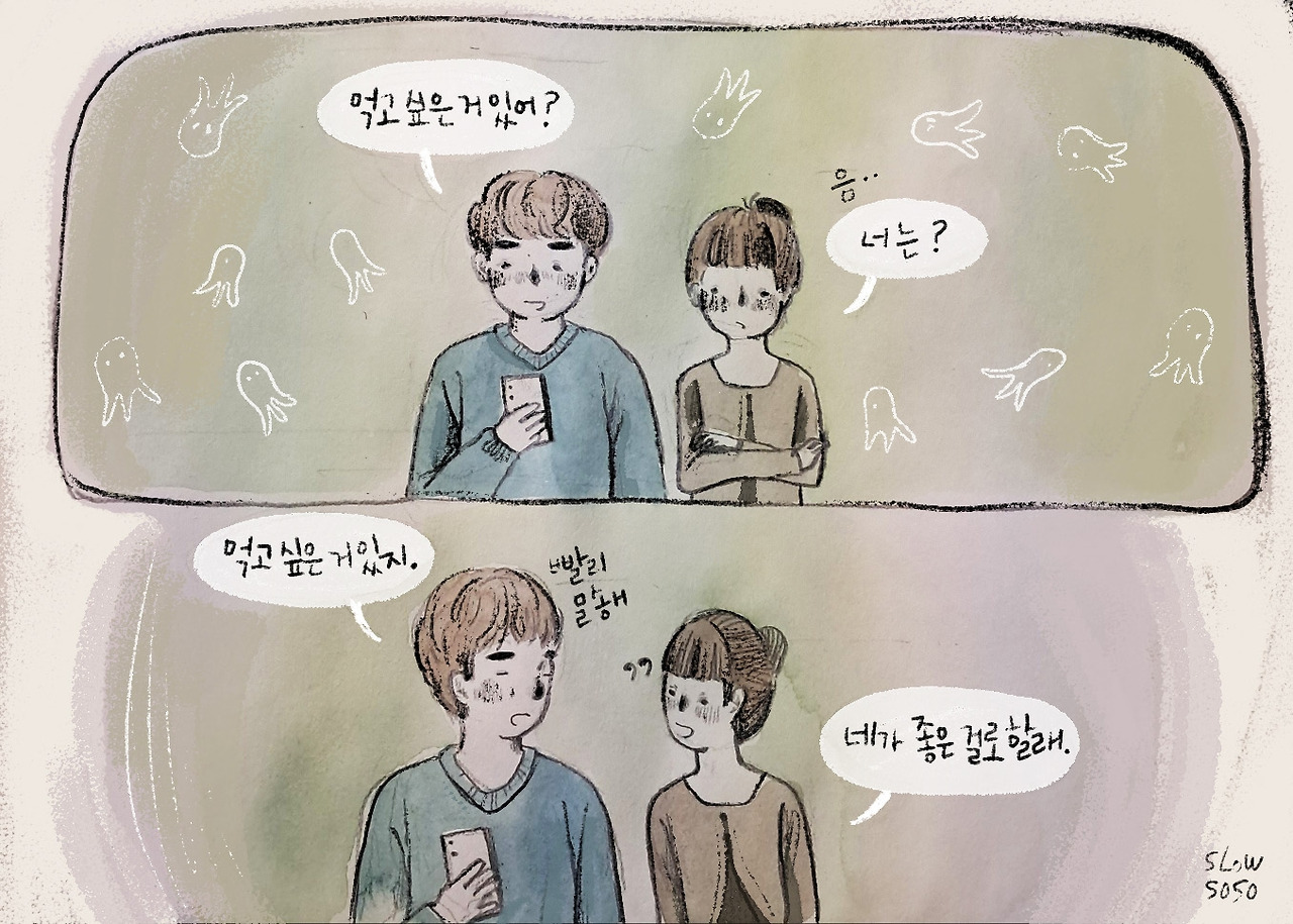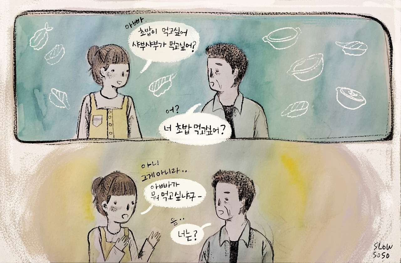 뭐 먹고 싶냐고 질문 하면 아빠는 꼭 되물어보고는 했어요. 항상 제가 더 먹고 싶은 걸 먹기 위해 표정을 살폈지요.