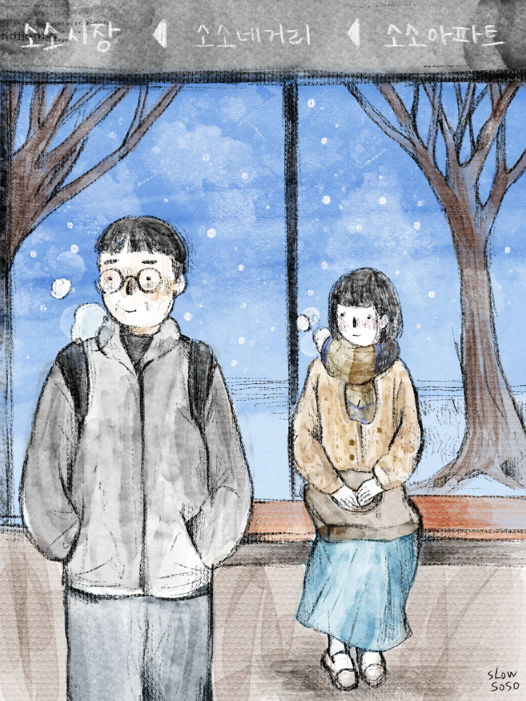 "버스 올 때 타더라도, 따신 데 앉아계셔요. 추운데 어서요."