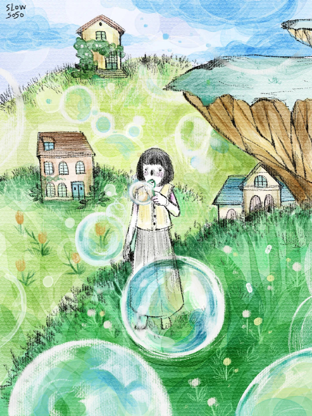 거대한 비눗방울 왕국에 들어가 있는 느낌이다. 숨을 크게 들이쉬고 후- 불면 뿜어져 나오는 비눗방울. 그렇게 생겨난 비눗방울은 심심한 나를 놀아주기도 하고, 곁을 맴돌기도 하다가 어느 순간 다른 곳으로 이동한다. 멀어져가는 비눗방울을 바라보다가 또 다시 숨을 크게 들이쉬고 후- 불어 새로운 비누방울을 맞이한다. 만남과 헤어짐이 연속인 삶에서 수많은 비눗방울이 탄생하고, 없어지기를 반복했다. 가끔은 멀어져 간 비눗방울이 생각나는 때도 왔다. 완전히 내 것이라고 여겼던 것이 그리움으로 바뀌어 다가왔다.