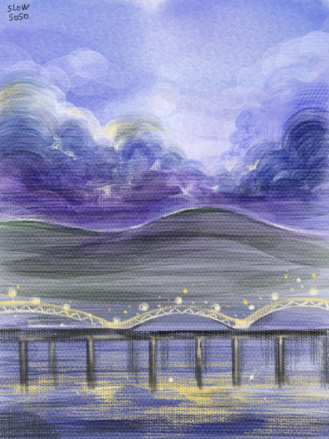 계절마다 부지런히 옷을 갈아입는 나무가 굳세다고 느꼈다. 그들이 보여주는 질서가 참 푸르다. 이 빛깔에 매료되니 또 다른 수려함을 찾았다. 보랏빛으로 물든 하늘, 흩어지는 구름의 모양, 물결과 하나 된 가로등. 눈앞의 벅참을 잊고 싶지 않아 종이에 슬며시 그려보았다. 그 페이지에는 작은 바람도 들어가 있다. 시간이 흘러도 아름다움을 눈치챌 수 있었으면 하는 바람. 때마다 나의 찬란함을 간직할 수 있었으면 하는 바람.