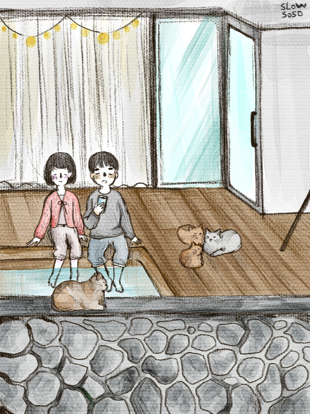 불멍이 제일이라는 디디의 생각에 바로 납득했다. 앞에서 타고 있는 장작은 고요함을 낭만적으로 만들어주는 요소였다. 그러니 오늘만큼은 나도 불멍이라는 확신을 내비쳐본다. 불씨가 꺼져갈 때쯤 작은 족욕탕에 따뜻한 물을 받았다. 온기가 채워지니 돌담을 넘어 외부냥들도 구경 왔다. 서로에게 몸을 기댄 고양이들이 꾸벅꾸벅 존다. 우리의 모습과 비슷하다. 달빛에 기대 평안함을 누리는 우리와.