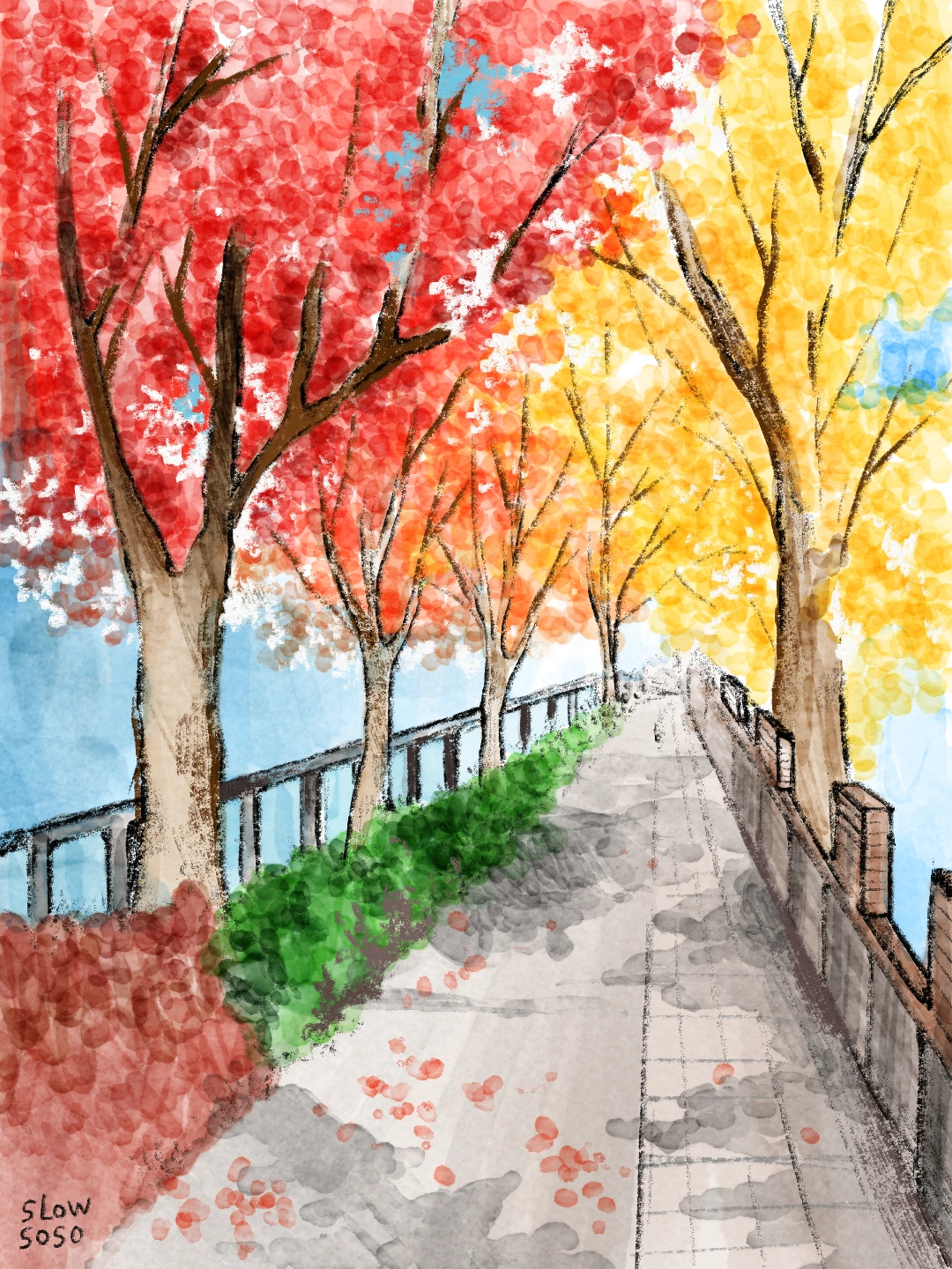 길 위에 흩뿌려진 회상을 다시금 거두었던 날의 시작점이다. 할 수 없이 집까지 걸어가야 했다. 소요 시간은 20분 정도. 걸음을 빨리 뗄 기운이 없던 나에게 맞춰진 속도였다. 발을 내디딜 때마다 노란 은행잎이 고개를 끄덕인다. 하늘을 자주 쳐다보지 못한 사이에 벌써 이만큼 물들었다. 크게 숨을 쉬어본다. 이 냄새를 뭐라고 해야 할까? 진한 가을 향기가 코끝에 들어찬다. 불처럼 강렬한 단풍잎도 봐달라고 손짓하니 고개를 더 높이 들었다. 설익은 초록 잎과 힘을 다하는 주황 잎, 최선을 다해 준비하는 잎들의 자태가 어여뻤다.