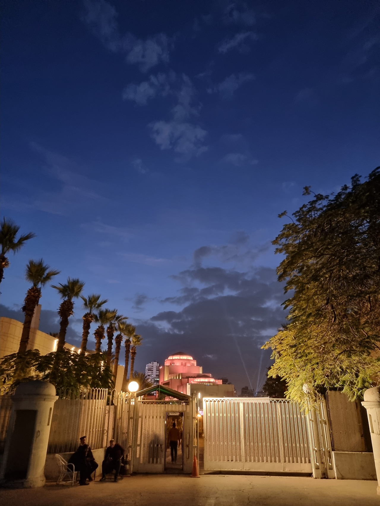 적다 보니 모든 게 엉망진창인 것 같지만... 걷다 보면 카이로 특유의 이국적 정취가 느껴졌다. 처음에는 무척 거슬렸던 클락션 소리가 하나의 효과음처럼 들리고, 밤하늘을 감싸는 뿌연 연기는 왠지 모를 신비로운 분위기를 감돌게 했다. 이곳 사람들은 이탈리아 사람 못지않게 화려한 손짓을 사용하며 큰 목소리로 이야기했다. 그 모습에서 왠지 모를 경쾌함이 느껴졌다. 그렇게 한 걸음씩 걷다 발길을 멈추게 하는 건축물을 우연히 마주했다. 경찰들이 지키고 있는 단단한 철문 너머 거대한 야자수가 줄지어 늘어서 있고 그 뒤로 커다란 모스크처럼 보이는 분홍색 건축물이 눈에 들어왔다.