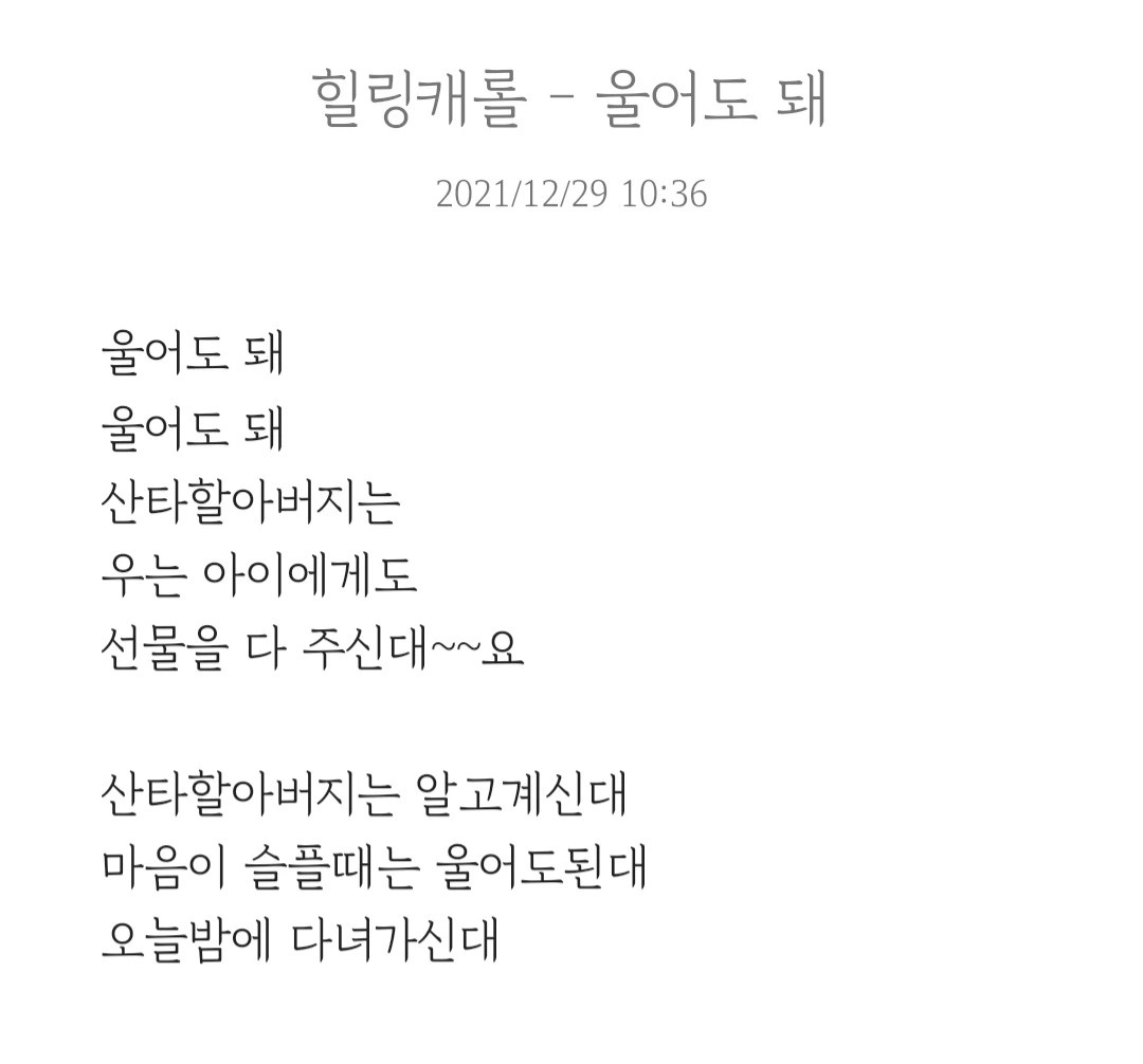 울지 말라고 억지로 억압하는 대신 맘껏 울어도 된다고 감정을 있는 그대로 수용할 줄 아는 태도가 담긴 노래가 진정한 캐럴이 되어야 하지 않을까?