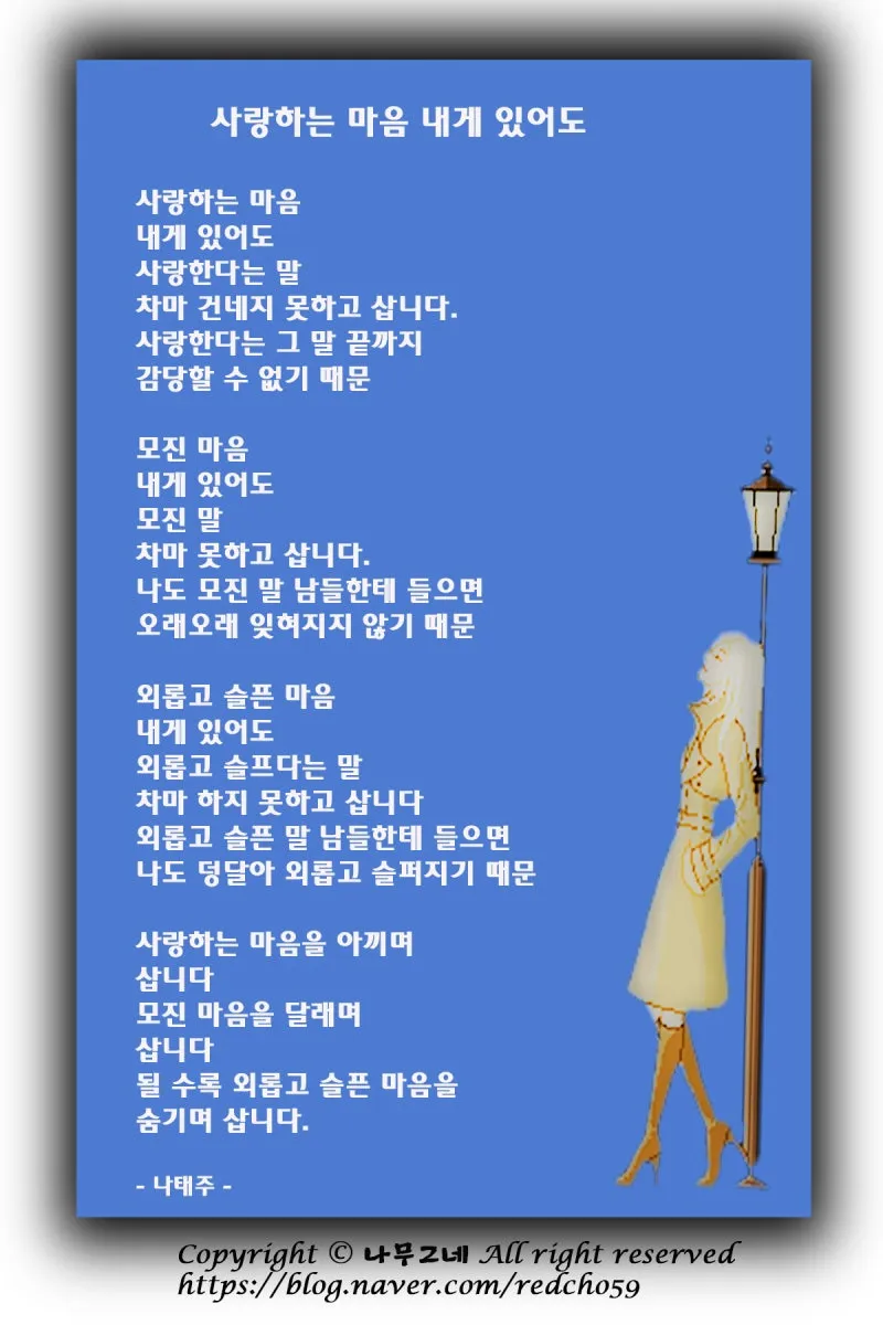 나태주 시인의 '사랑하는 마음 내게 있어도' 처럼, 나이가 들어서야 비로소 이해되는 시가 또 있을까 싶다. 시가 변한 것이 아니라, 그 시를 읽는 내가 변했을 뿐인데 그 차이는 생각보다 크다. 어쩌면 어떤 시들은 읽히는 나이가 따로 정해져 있는지도 모르겠다는 생각이 든다. 조금 늦게 도착해야만, 제대로 마음에 들어오는 말들이 있다.