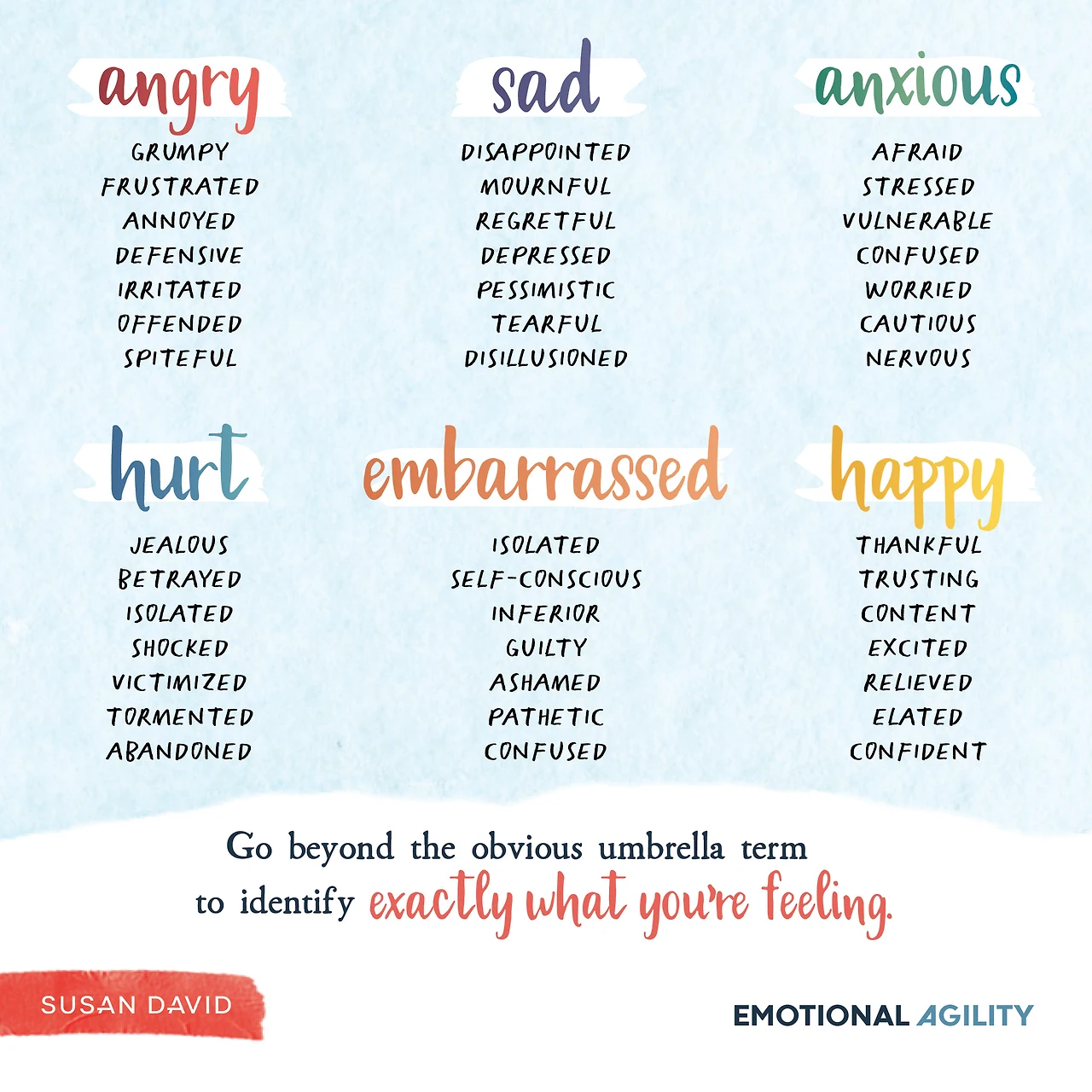 예를 들어, 상처받은 감정 ("I feel hurting") 을 느낄 때, 그 상처가 '버림받은 느낌'인지'(abandoned) '배신당한 느낌' (betrayed)인지 파악하는 것이 중요하다. 두 감정 모두 상처받은 것은 사실이지만, 모든 상처받은 감정이 시간이 지난다고, 좀 쉰다고 나아지지는 않는다. 어떤 상처에서 온 감정인지를 알아야 이를 극복하는 구체적인 방법이 생긴다. 버림받은 느낌에서 좋아지기 위해서는 좀 더 많은 관심과 존재감을 인정받아야 하지만, 배신받은 느낌은 그 느낌을 준 사람에게 제대로 된 사과나 정확한 이유를 듣는 것이 중요할 수 있다는 것이다.