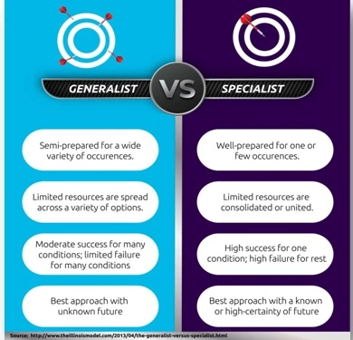 스페셜리스트는 특정 분야에서 깊이 있는 전문성을 가진 사람이다. 이들은 한 분야에 집중하여 높은 신뢰와 권위를 얻으며, 전문성이 요구되는 직무에서 높은 수요와 기회를 얻을 수 있다. 다만 새로운 분야로 전환하거나 변화하는 환경에 적응하는 어려움이 있고, 같은 분야의 다른 전문가들과 경쟁해야 하는 상황이 생길 수 있다.