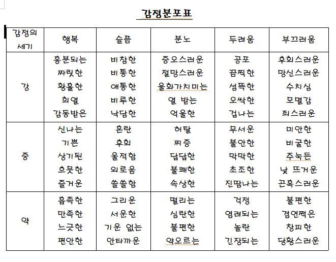 중요한것은 마음근육을 키우기 위해서는 이것이 어떤 감정인지 아는것 부터가 시작은 맞다. 감정의 종류는 너무 많기 때문에 대표적인 감정표를 가지고 훈련했다.