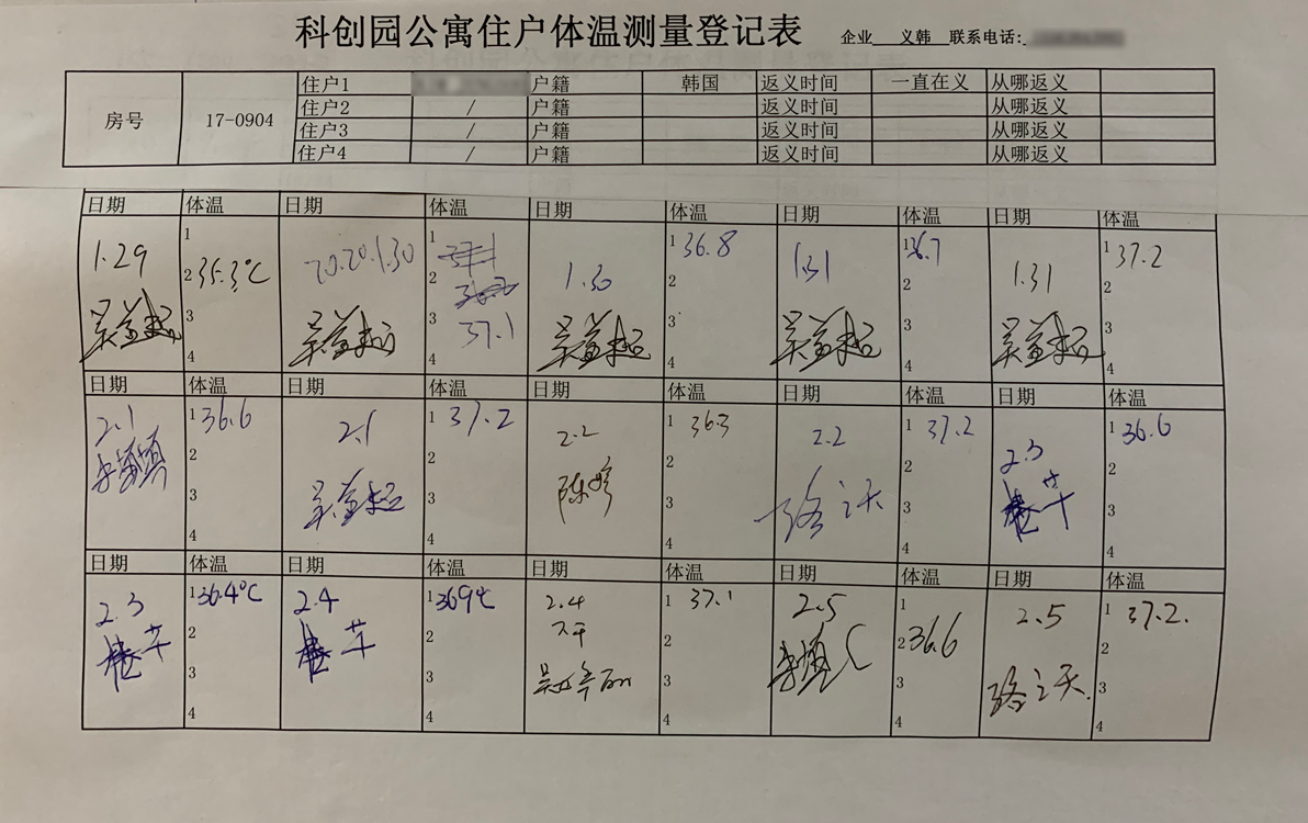 그리고 언제 이곳에 왔으며, 최근 보름 사이 타 지역을 방문한 적이 있다면 기재하고, 없다면 그 사실을 서약하라는 서류도 작성되었다. 이윽고 나의 인적사항과 매일 2회 체온을 기록하기 위한 칸이 나눠진 서류가 마치 현황판처럼 복도 문 옆에 붙었다.