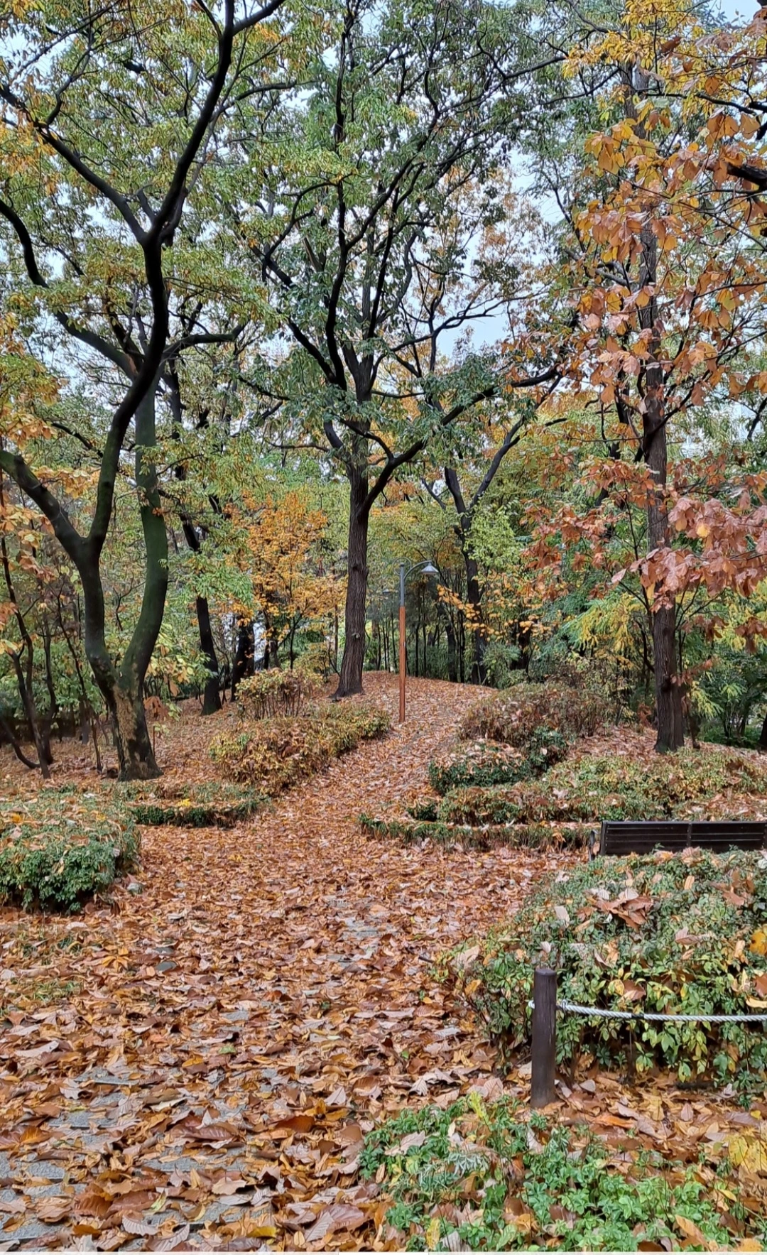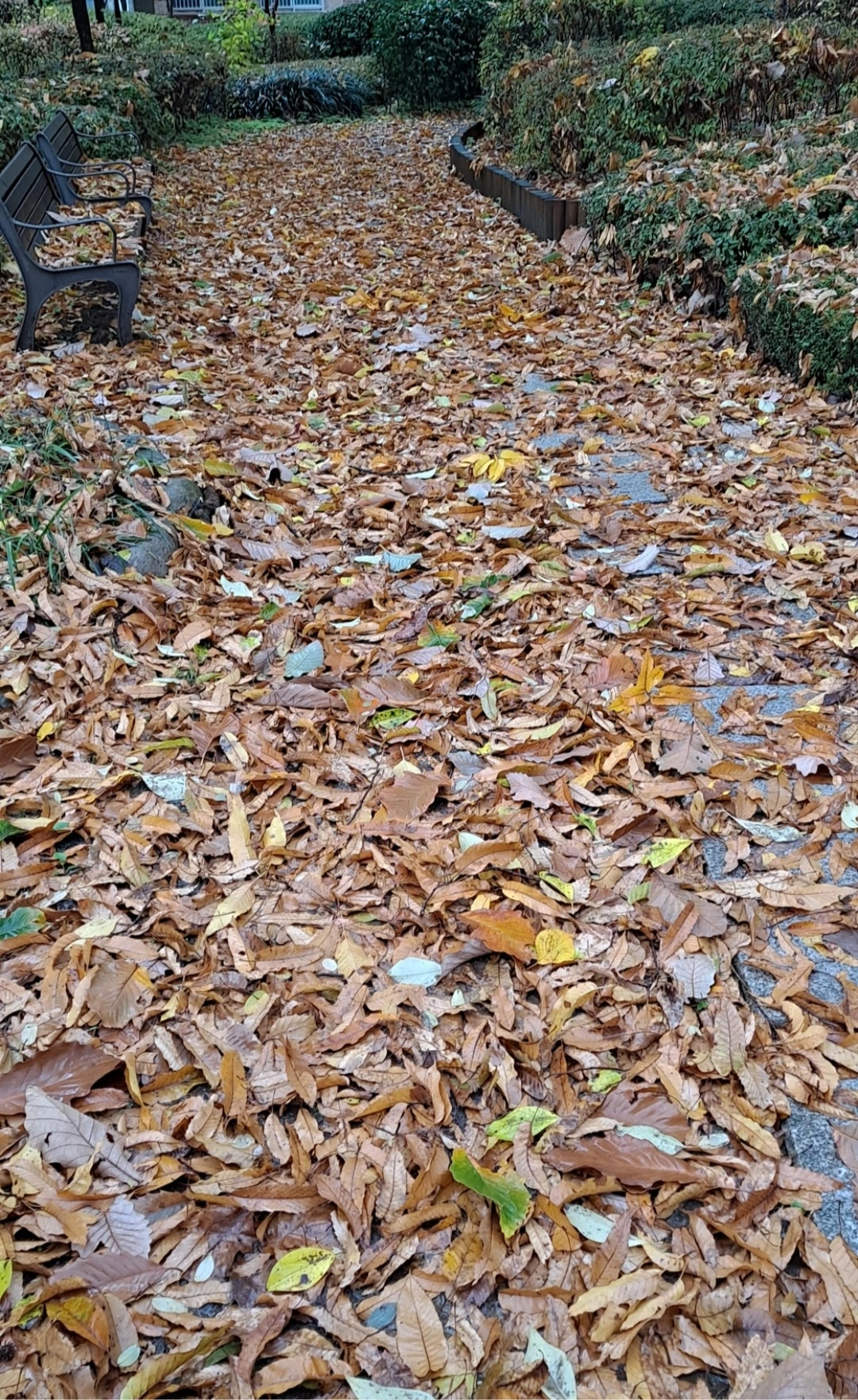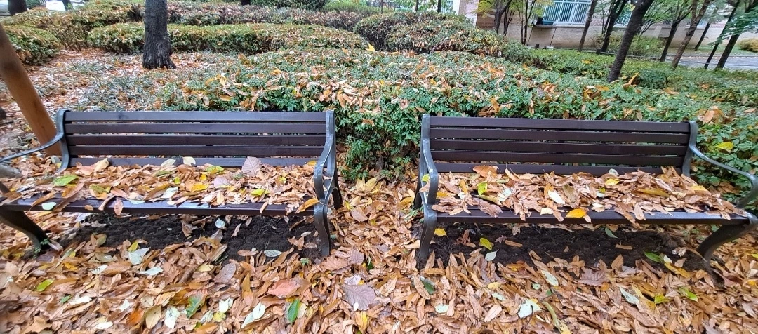 나란한 두 개의 벤치 위에 낙엽이 한가득 쌓여있다. 지금의 이 벤치는 오가는 사람의 잠시 쉬는 장소가 아닌 그냥 한 폭의 그림으로 보존되었으면 싶다. 그러므로 누군가 이 벤치 위의 가랑잎을 쓸어내지 않기를 바란다.
